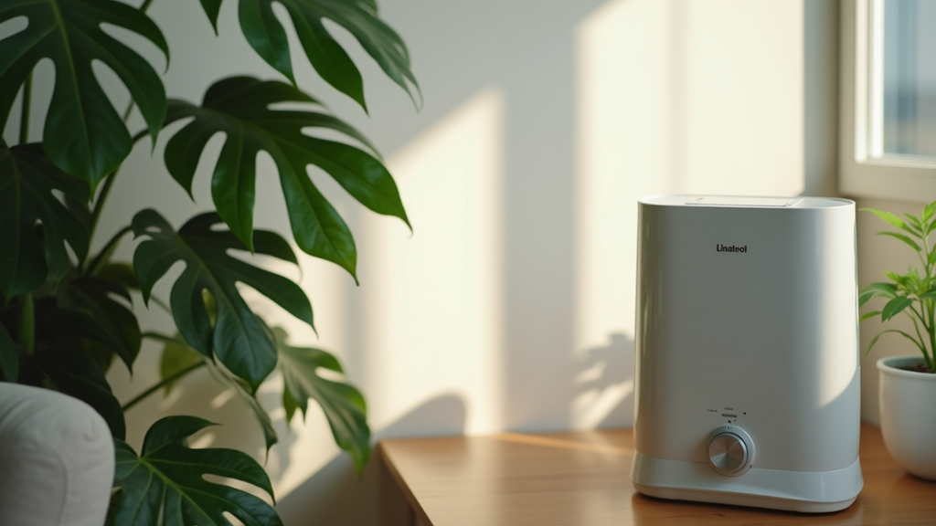 Humidifier positioned next to a healthy Monstera plant enhancing indoor humidity.