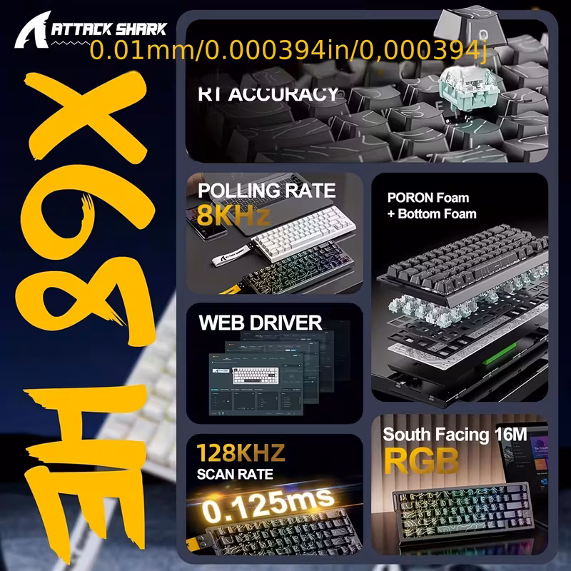 The ATTACK SHARK X68 HE 8000 Hz Rapid Trigger Gaming Keyboard is the ultimate weapon for gamers, streamers, and professionals who demand pure performance. Built around magnetic switch technology with 0.01 mm trigger accuracy, this next-generation keyboard captures every movement with microscopic precision.