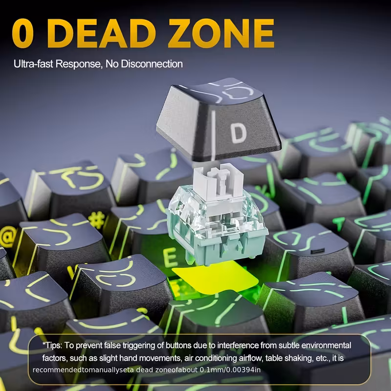 Instant reset (Rapid Trigger) means the key resets the moment it moves upward by 0.01 mm—perfect for rhythm games,