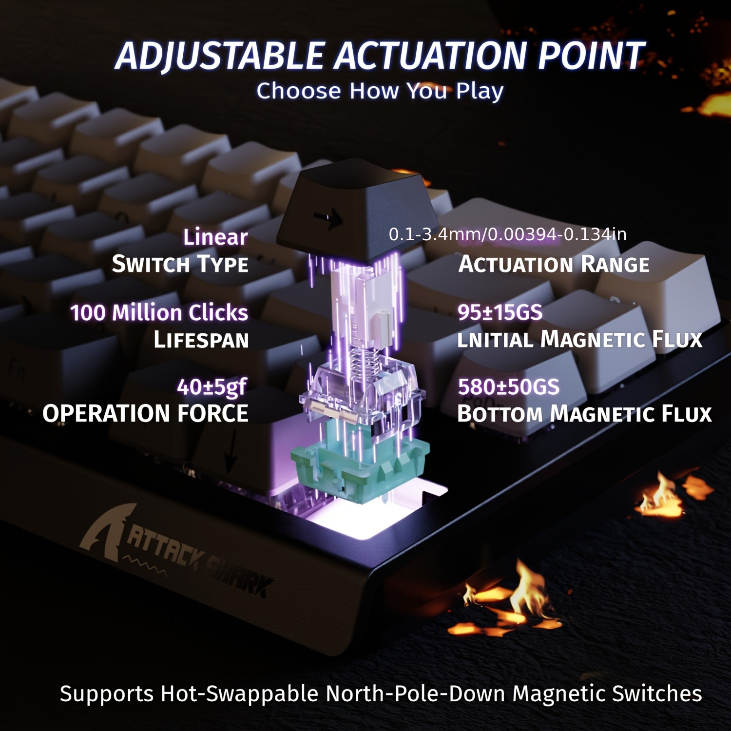 At the core of the ATTACK SHARK X68 HE lies next-generation Hall-effect magnetic switches, engineered to redefine responsiveness. Unlike traditional mechanical keyboards, magnetic switches operate through non-contact magnetic sensors that detect key movement with extreme precision.