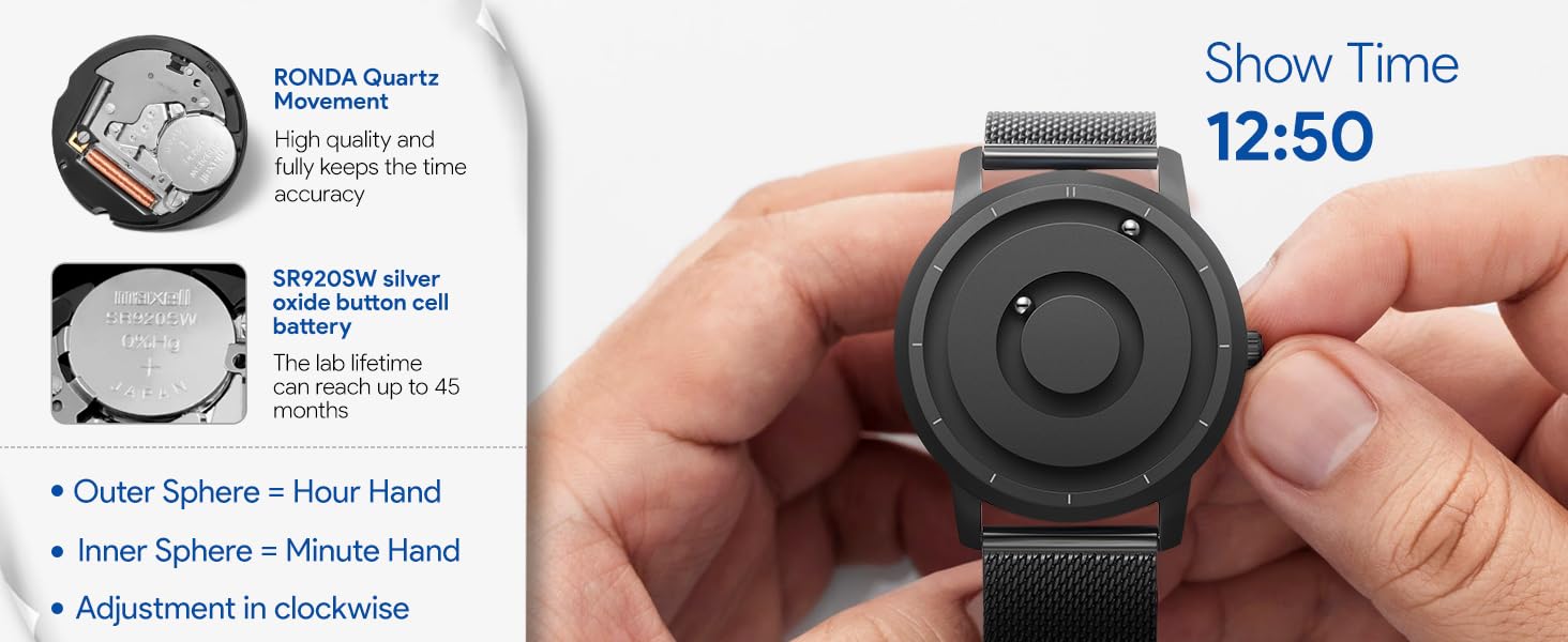 • Movimiento de cuarzo estable: Movimiento de cuarzo superior premium para reloj magnético EUTOUR para hombre, sincronización precisa, rendimiento confiable y estable, longevidad y alimentado por batería SR920SW por hasta 45 meses