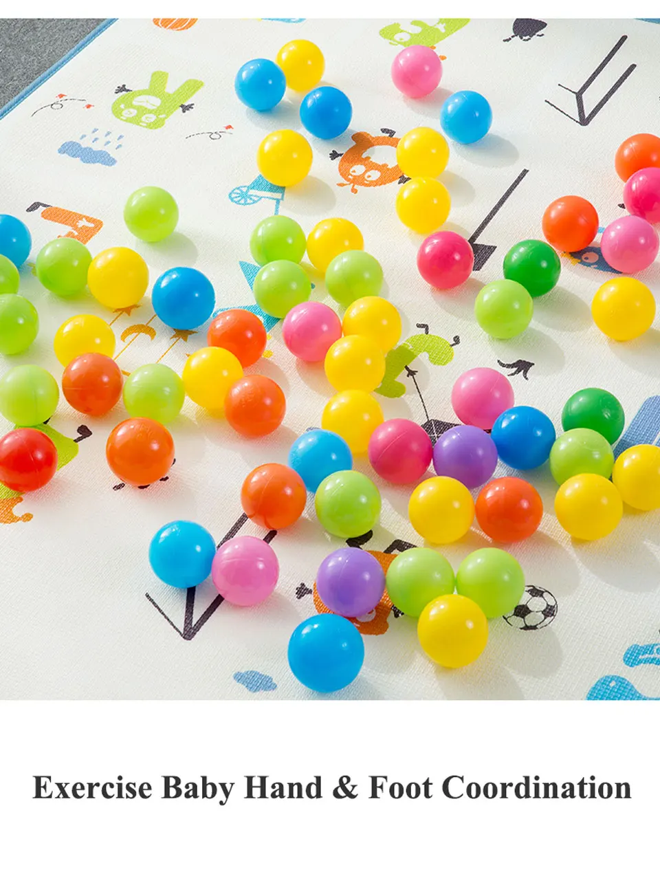 Materiales ecológicos: Fabricadas con plástico ecológico y no tóxico, estas pelotas son seguras para los niños y respetuosas con el medio ambiente. Libres de químicos dañinos, cumplen con las normas de seguridad para juguetes de bebés.