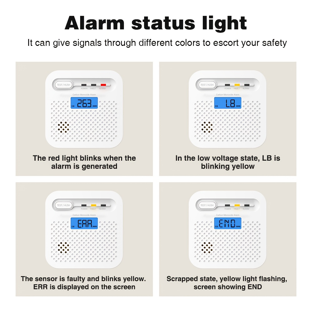 The 10-Year CO Alarm for RV, Basement & Garage: TUYA Smart Remote Alerts, Wide LCD, Electrochemical Sensor - Low Power, No Battery Change Needed also includes multiple indicator lights that display device status, including power, fault warnings, and alarm activation. These indicators make it easy for users to confirm the device is functioning correctly.