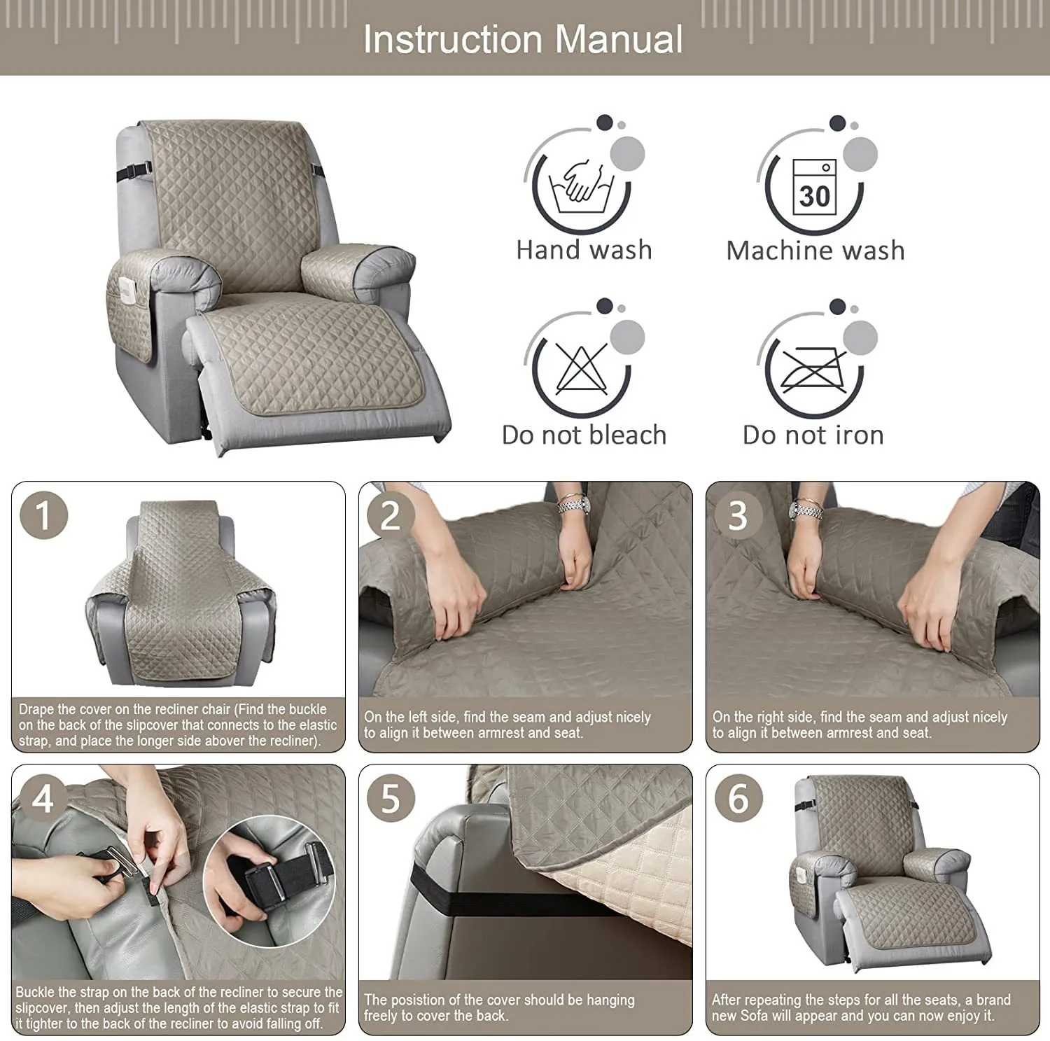 Non-Slip Design: The round silicone rubber backing of the recliner sofa cover is designed to make the reclining sofa slipcover more firmly stay in your sitting area. Elastic straps and non-slip buckles are included in each slipcover reclining sofa to stabilize the seat and prevent the back of the recliner from slipping off.