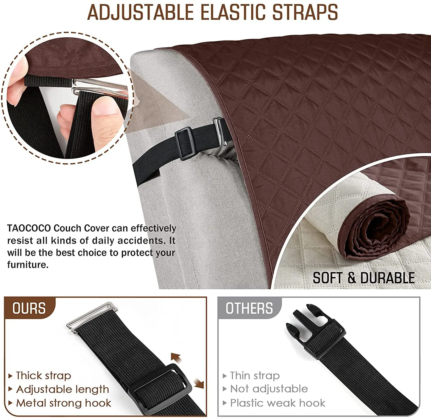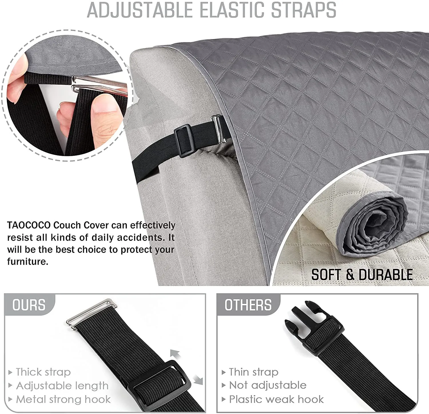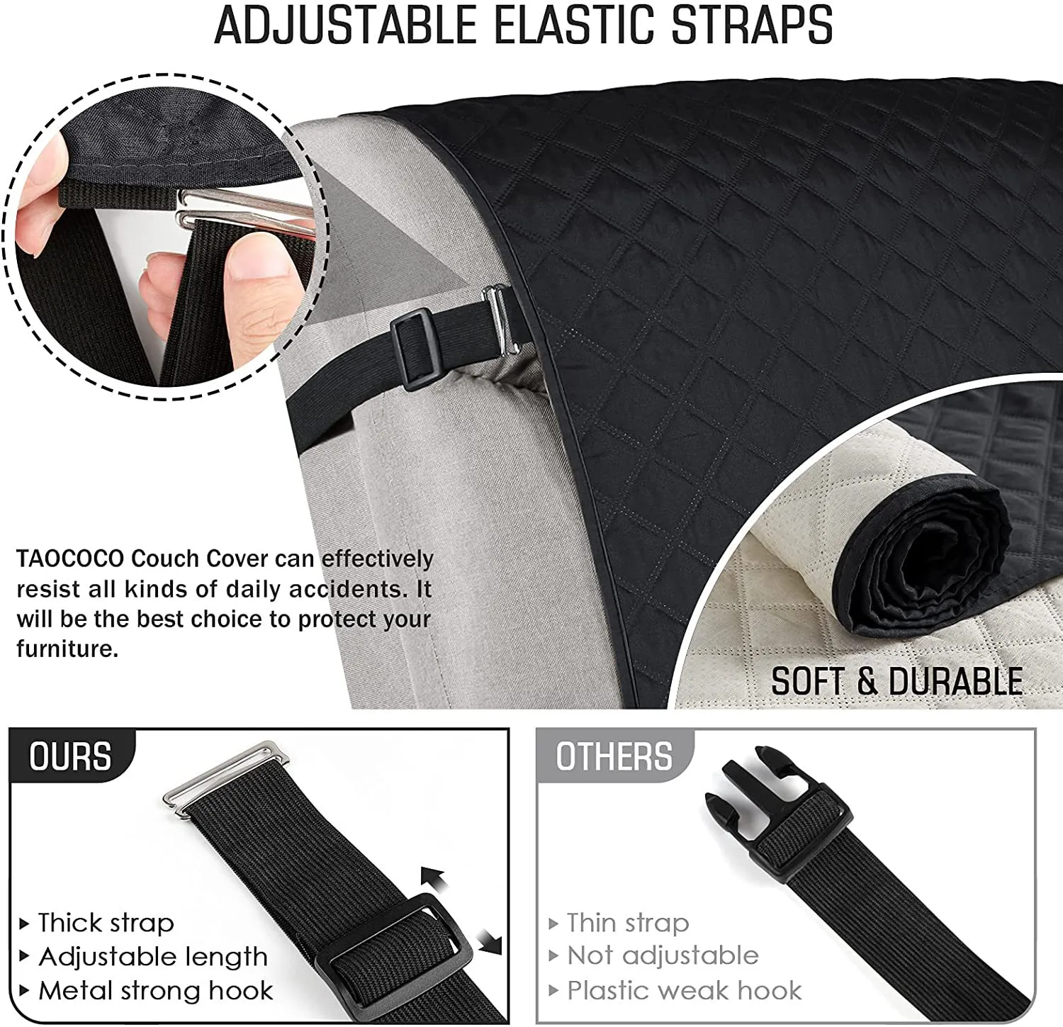 After extensive market research, we have added straps to the back of the couch covers with round buckle, which prevent the covers from