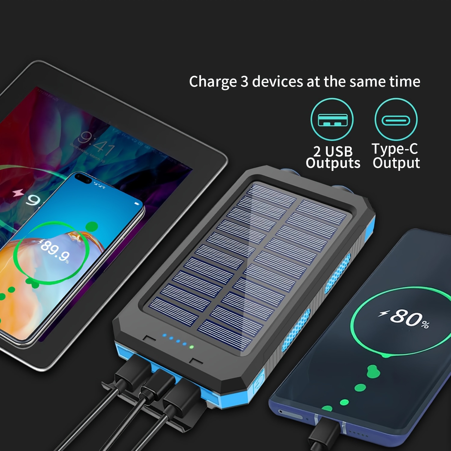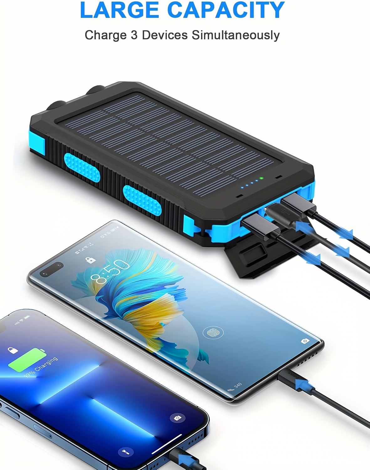 The 10000mAh Solar Power Bank | External Backup Battery Power Pack with USB C Input/Output, LED Flashlights, Compass, Dual USB Ports, Compatible with Samsung, iPad, Suitable for Outdoor, Camping, Fast Charging comes equipped with dual USB ports and a USB-C input/output, allowing users to charge multiple devices simultaneously. This makes the 10000mAh Solar Power Bank | External Backup Battery Power Pack with USB C Input/Output, LED Flashlights, Compass, Dual USB Ports, Compatible with Samsung, iPad, Suitable for Outdoor, Camping, Fast Charging highly efficient for families or groups traveling together.