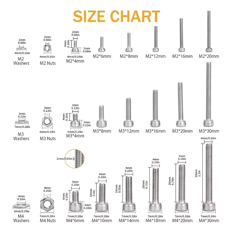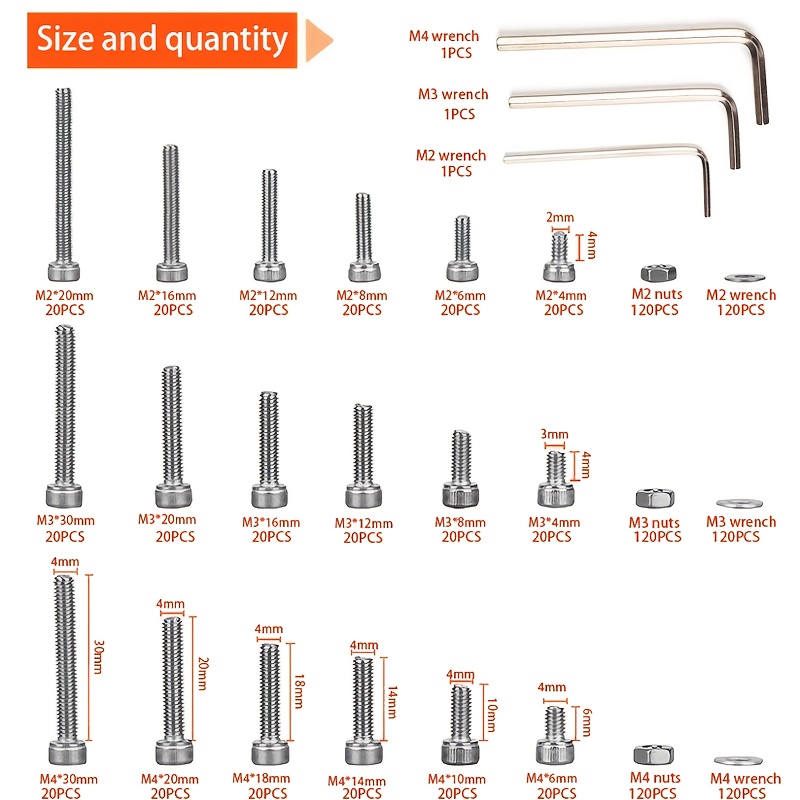 Choose the 1080pcs M2, M3, and M4 Stainless Steel Screws, Bolts, Nuts, and Washers Set for its comprehensive selection, high-quality 304 stainless steel material, and convenience. Whether you're working with electronics, machinery, or home appliances, this set offers precision fasteners that ensure secure and reliable results. The included hex socket cap heads and Allen wrenches make it easy to work with these fasteners, making it the ideal choice for professionals and DIY enthusiasts alike.