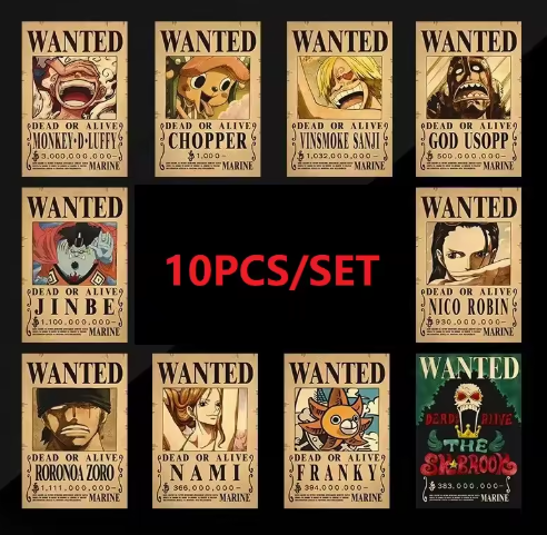 10PCS Anime Luffy Straw Hat Pirates One Piece Wanted Poster Stickers Vintage Painting Kid Bed Room Wall Decorate Adult Toy Gift