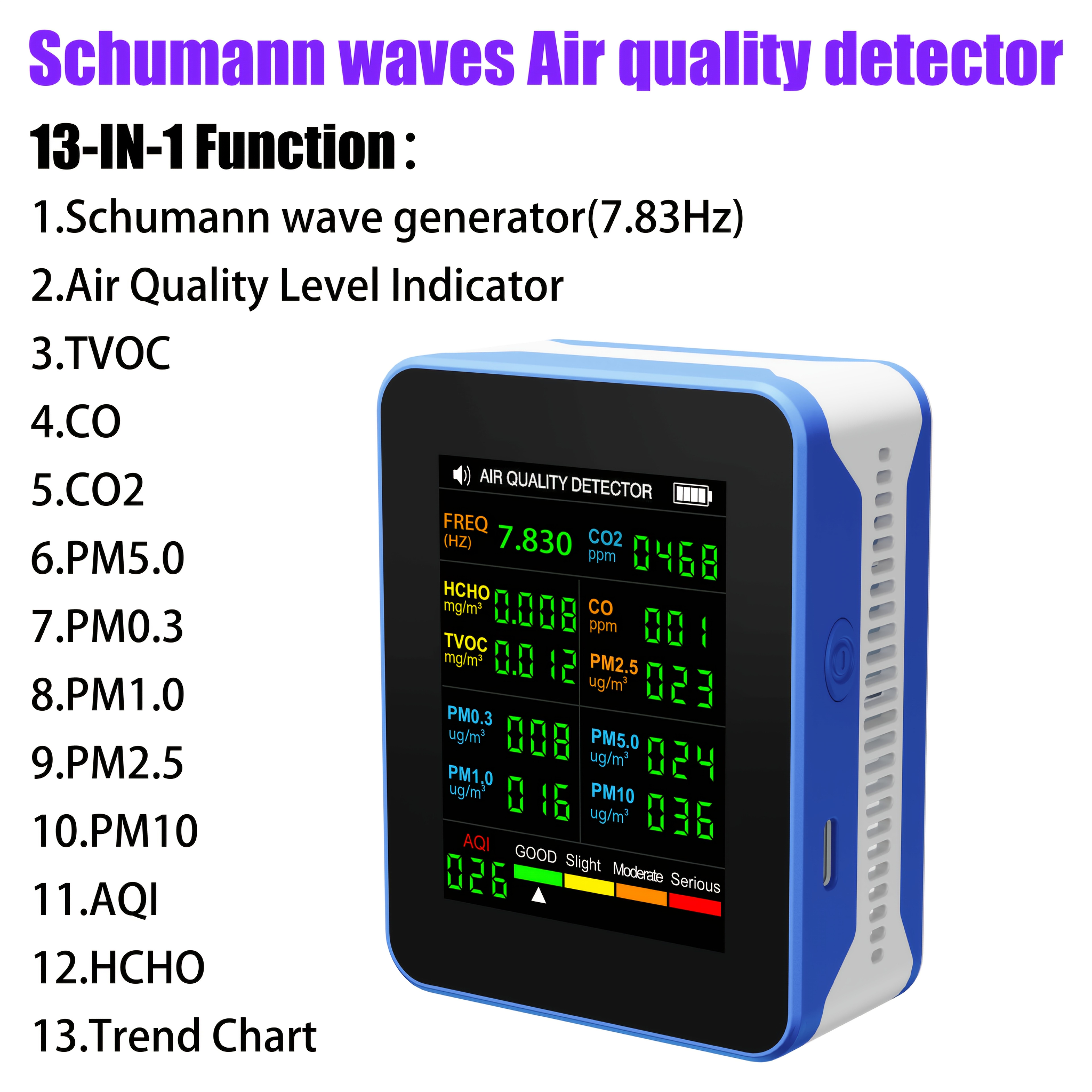 13-IN-1 Schumann Waves Air Quality Detector with 7.83Hz Ultra-Low Frequency Pulse Wave, CO2, PM2.5, PM10, PM1.0, PM0.3, PM5.0, HCHO, TVOC, AQI And CO, Rechargeable Battery, USB Powered for Home, Travel, Office, And Indoor Use