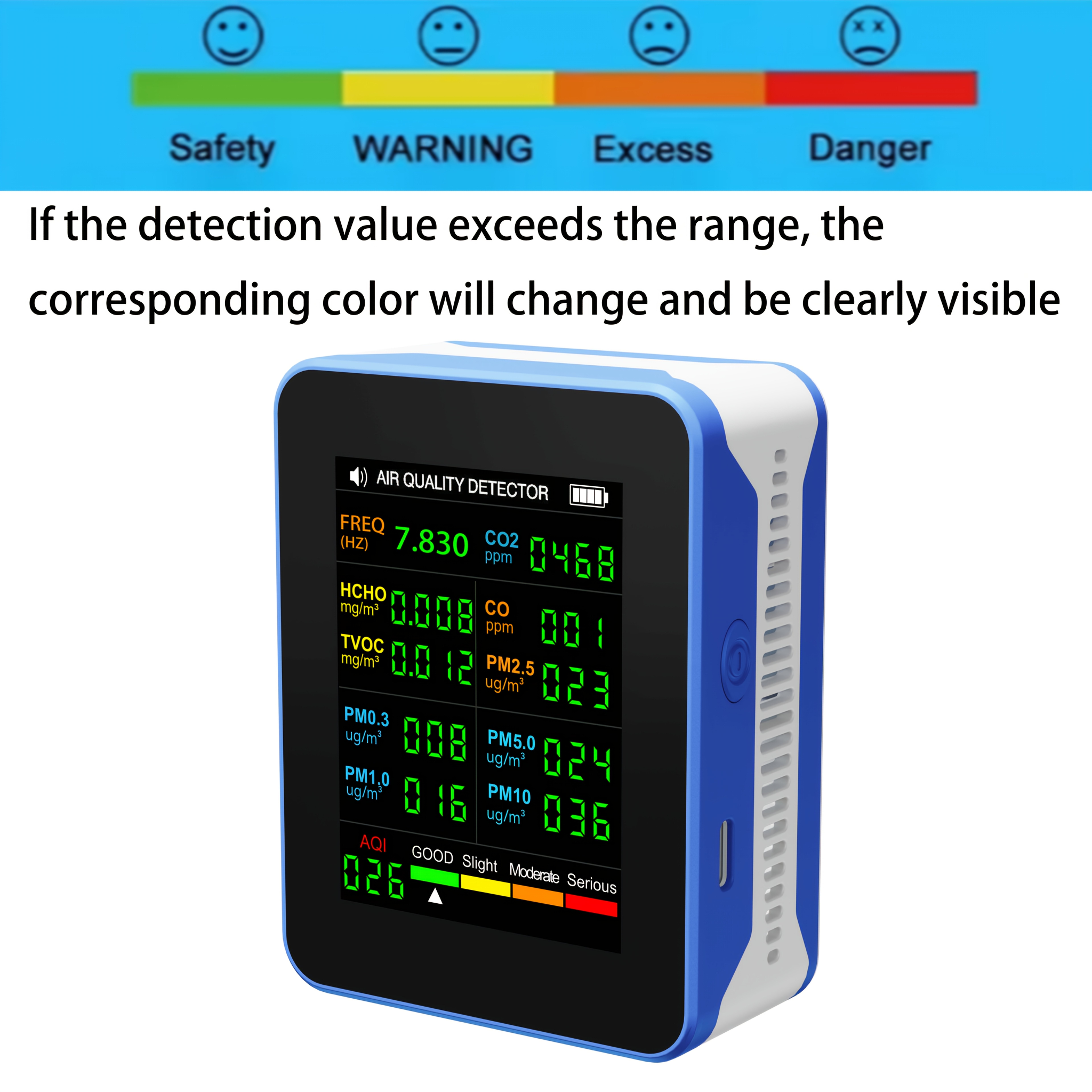 This compact air quality monitor integrates thirteen different environmental monitoring functions into a single device. These functions allow the detector to analyse multiple types of airborne particles and gases commonly found in indoor environments. The device measures particulate matter levels including PM0.3, PM1.0, PM2.5, PM5.0, and PM10, providing a detailed understanding of airborne particle concentrations that may affect air quality.