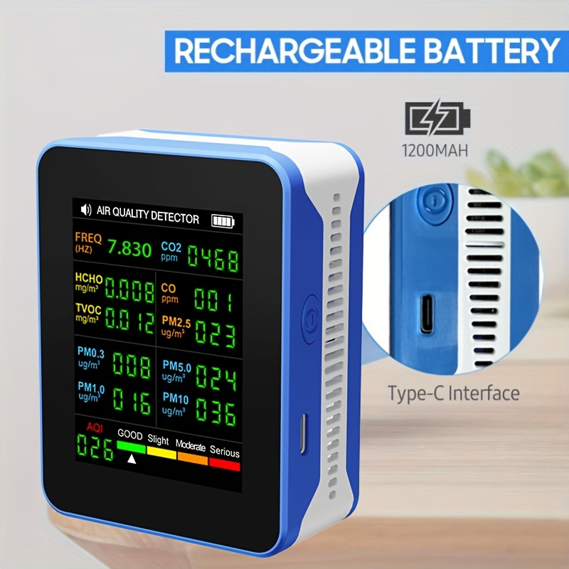 The portable design and rechargeable battery make it convenient to use across multiple environments, ensuring that air quality monitoring remains accessible wherever it is needed.