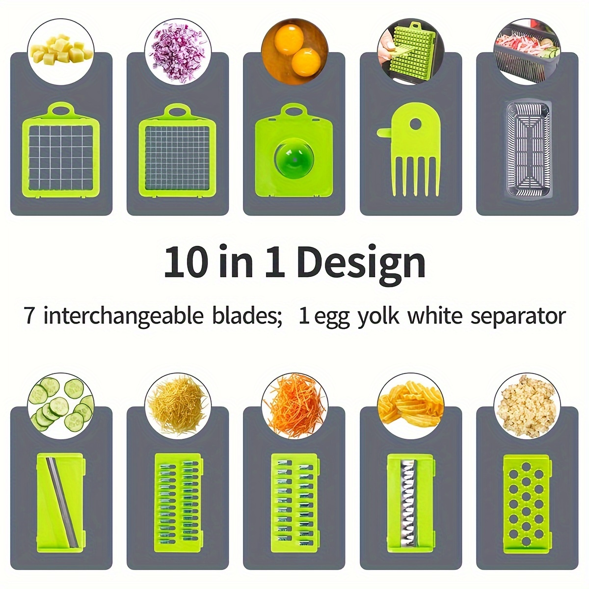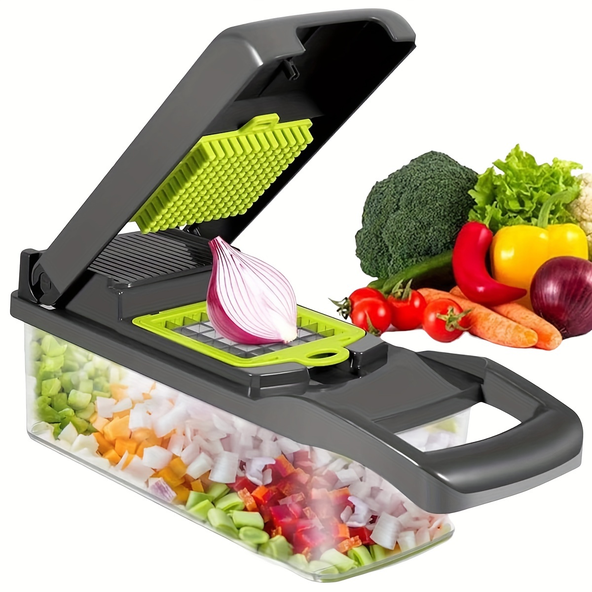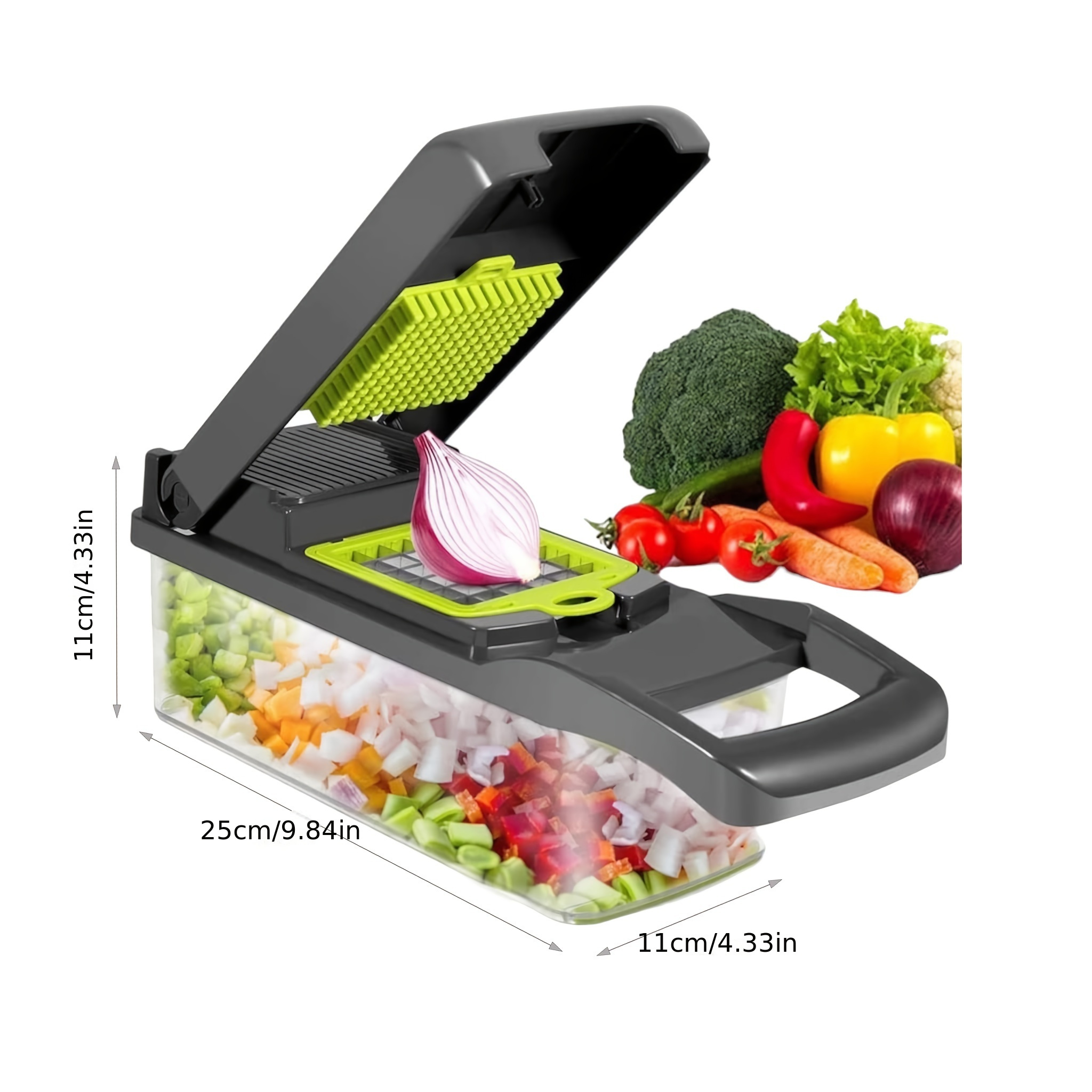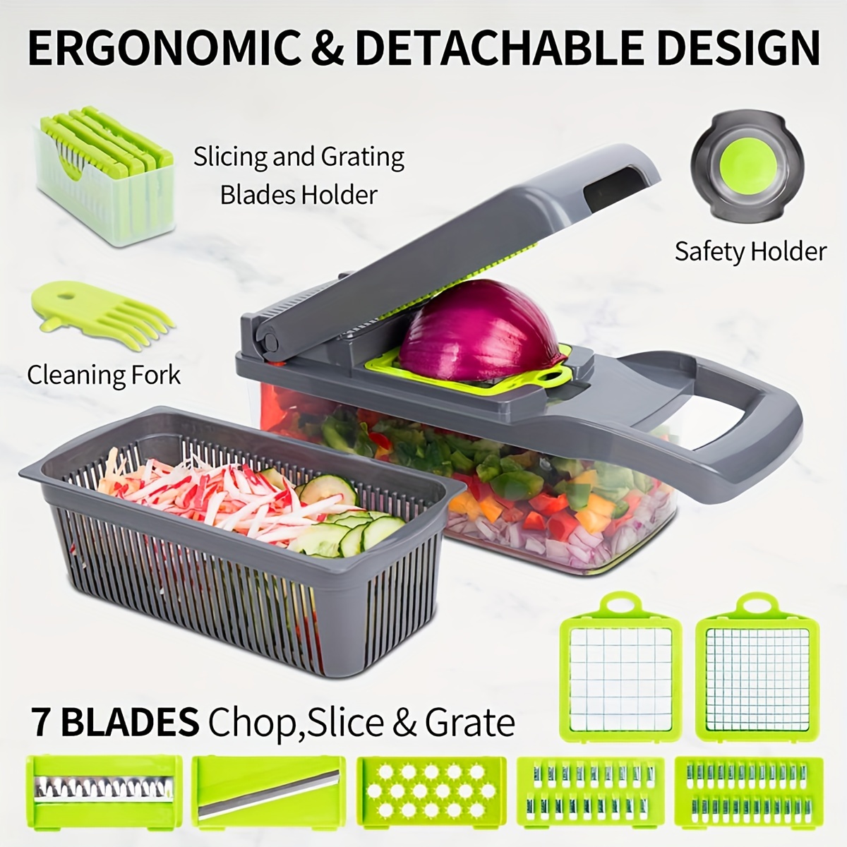 This 14-in-1 vegetable cutter and slicer is designed to meet all your kitchen slicing and dicing needs. It features 14 interchangeable blades that allow you to slice, dice, julienne, grate, and chop vegetables, fruits, and even cheese with precision. The durable blades are made from high-quality stainless steel, ensuring sharpness and long-lasting performance.