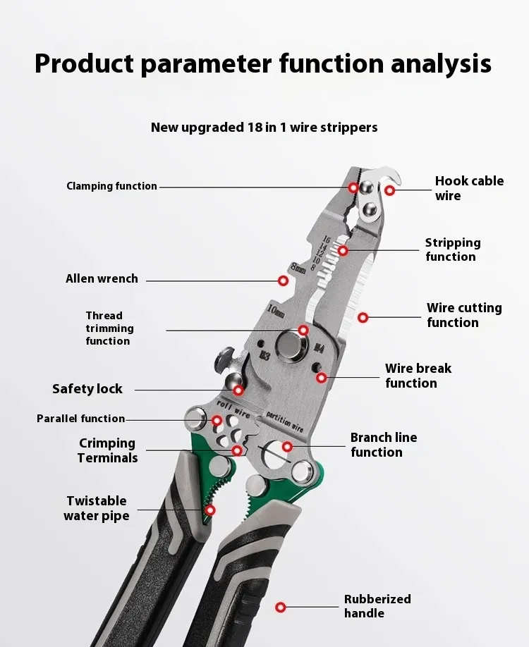 The 18-in-1 Multifunctional Folding Pliers are a versatile multi-tool built to handle a wide range of everyday tasks with ease. At its core, it functions as a strong, reliable pair of pliers, while folding out to reveal multiple integrated tools that support cutting, tightening, shaping, and basic repairs.