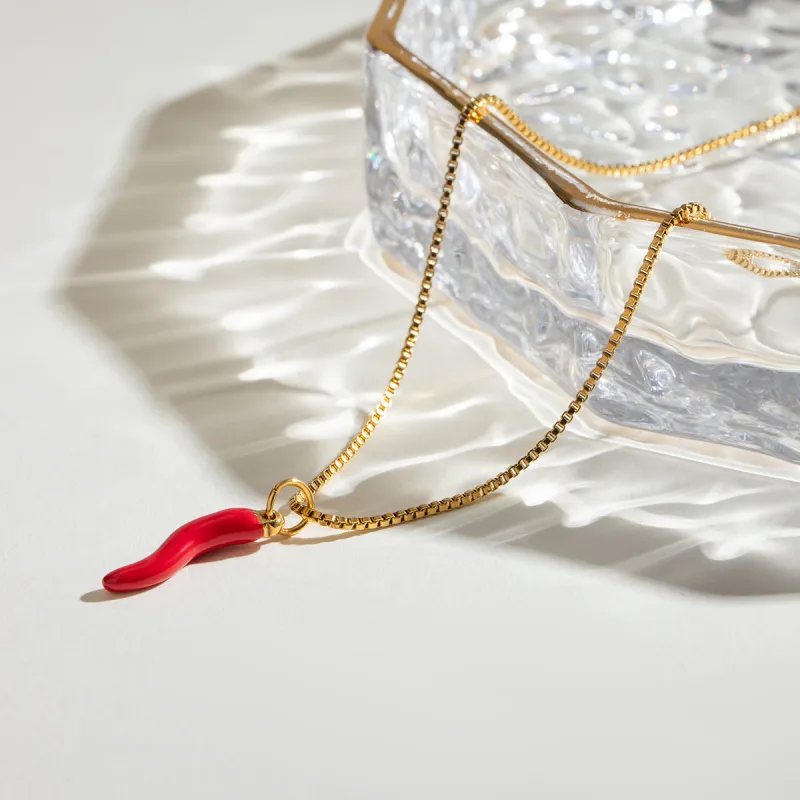 18K Gold Plated Stainless Steel Necklace with Red Enamel Chili Pepper Pendant