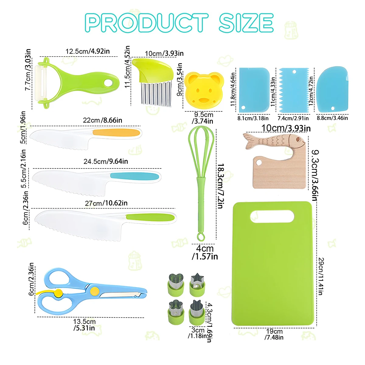 Complete 18-Piece Cooking Set: The set includes 18 different kitchen tools, including kid-safe knives, a cutting board,