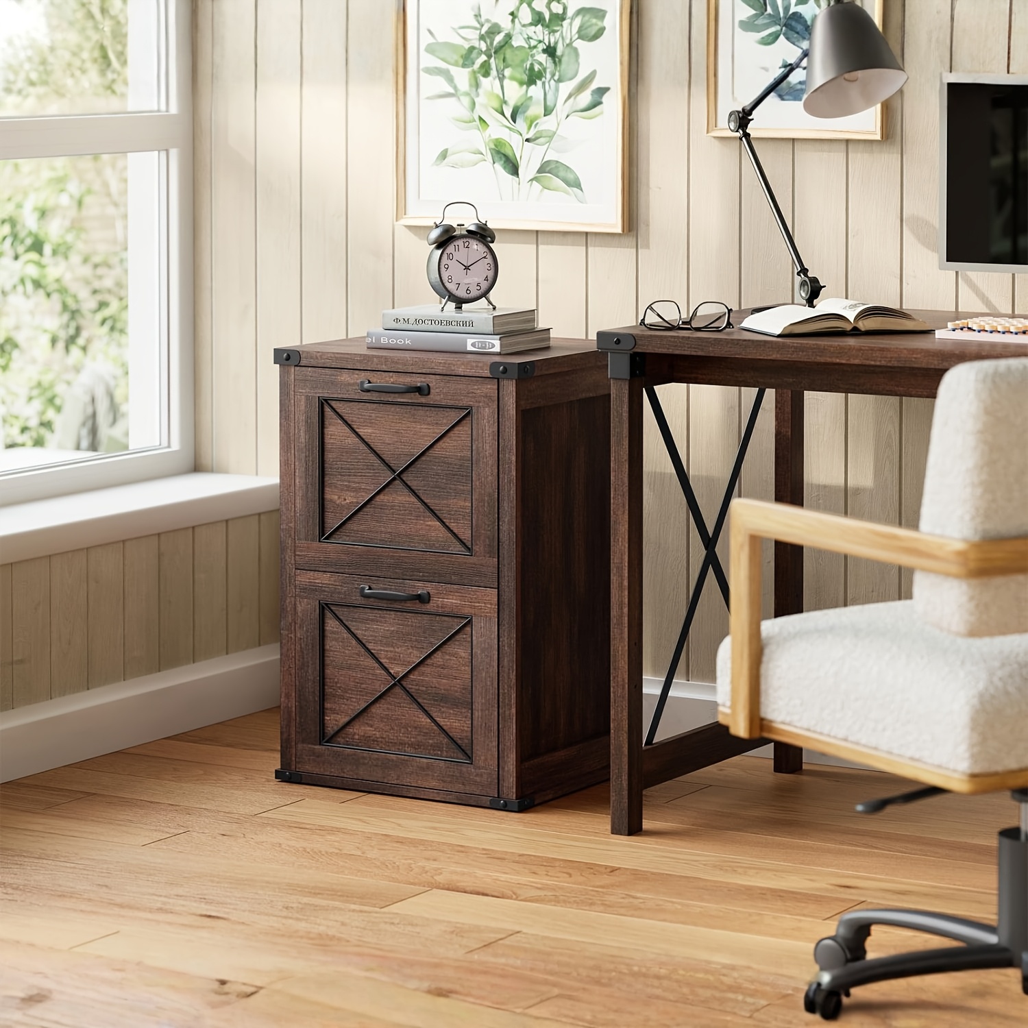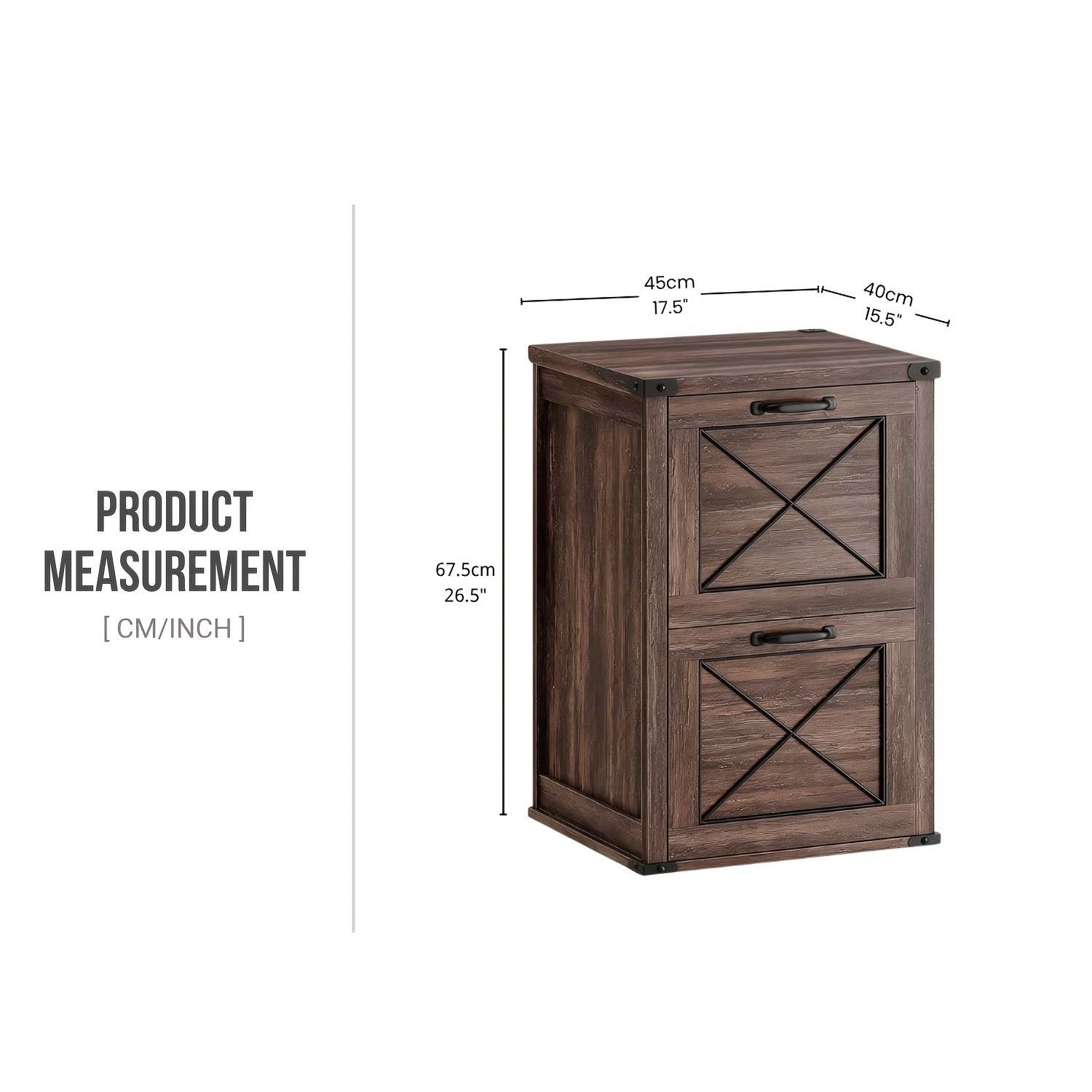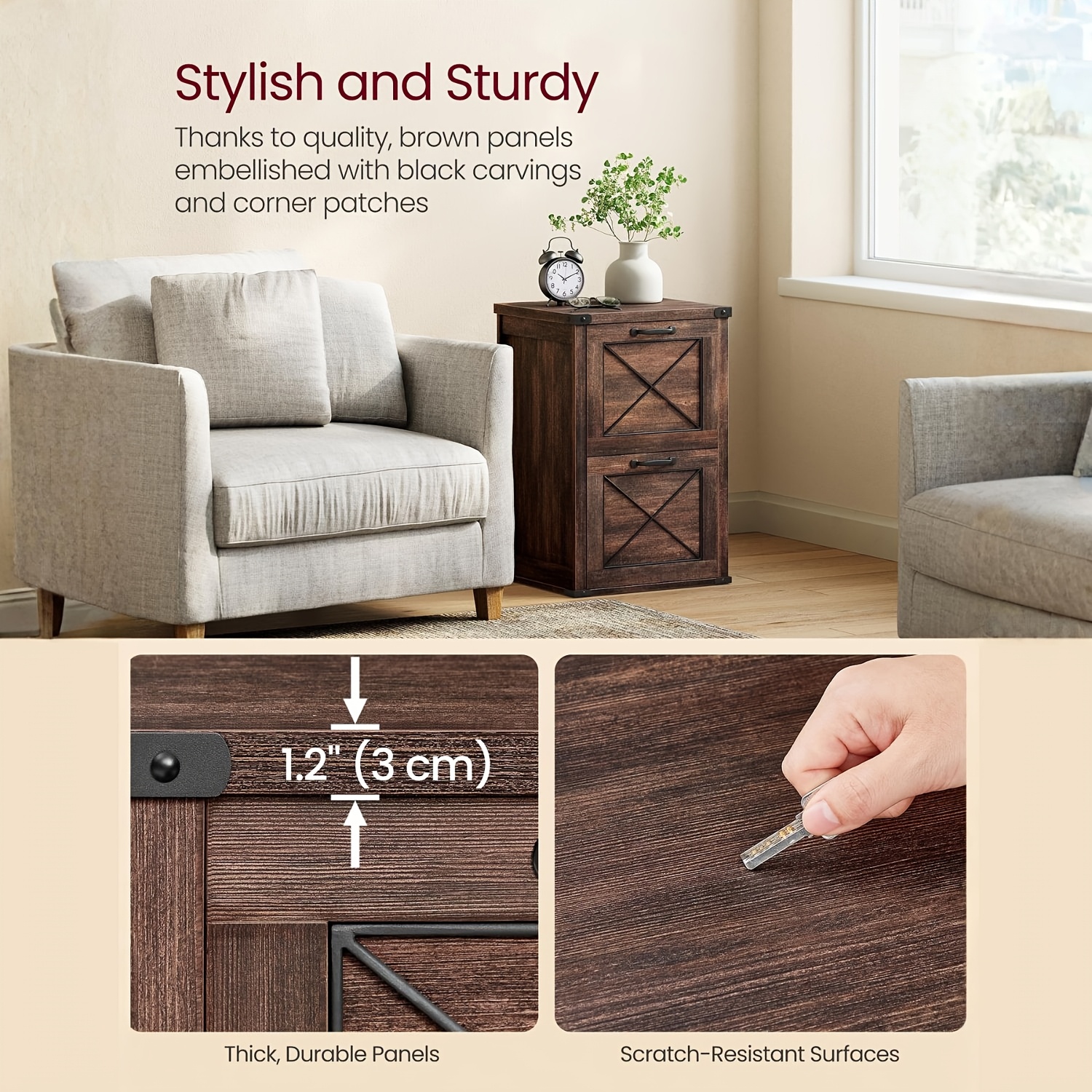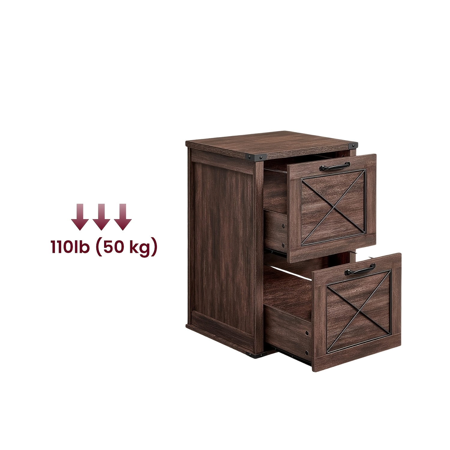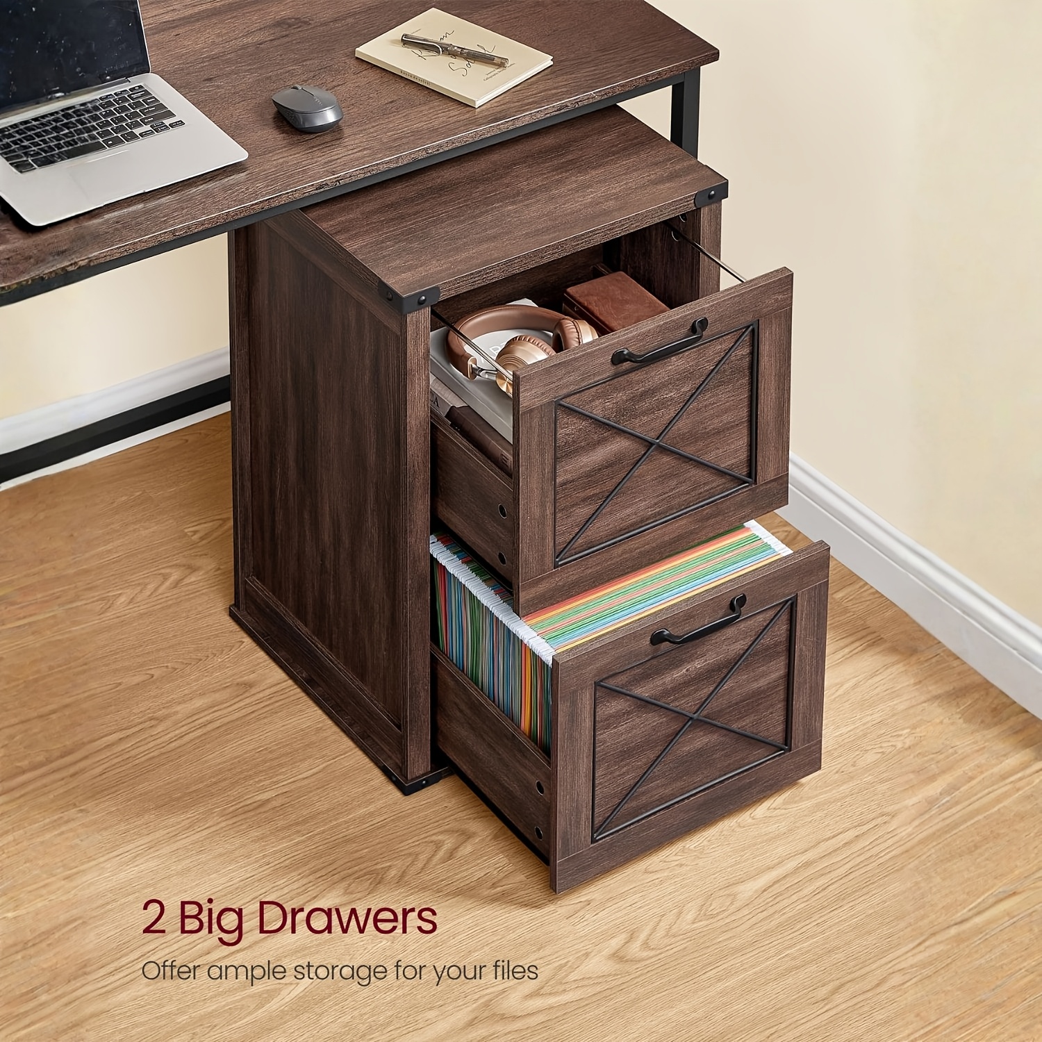A sturdy and stylish storage solution featuring durable wood construction, reinforced black metal corners, and a scratch-resistant rustic finish. Includes two large drawers and an adjustable hanging rail for versatile file organization, all in a compact design that fits anywhere.