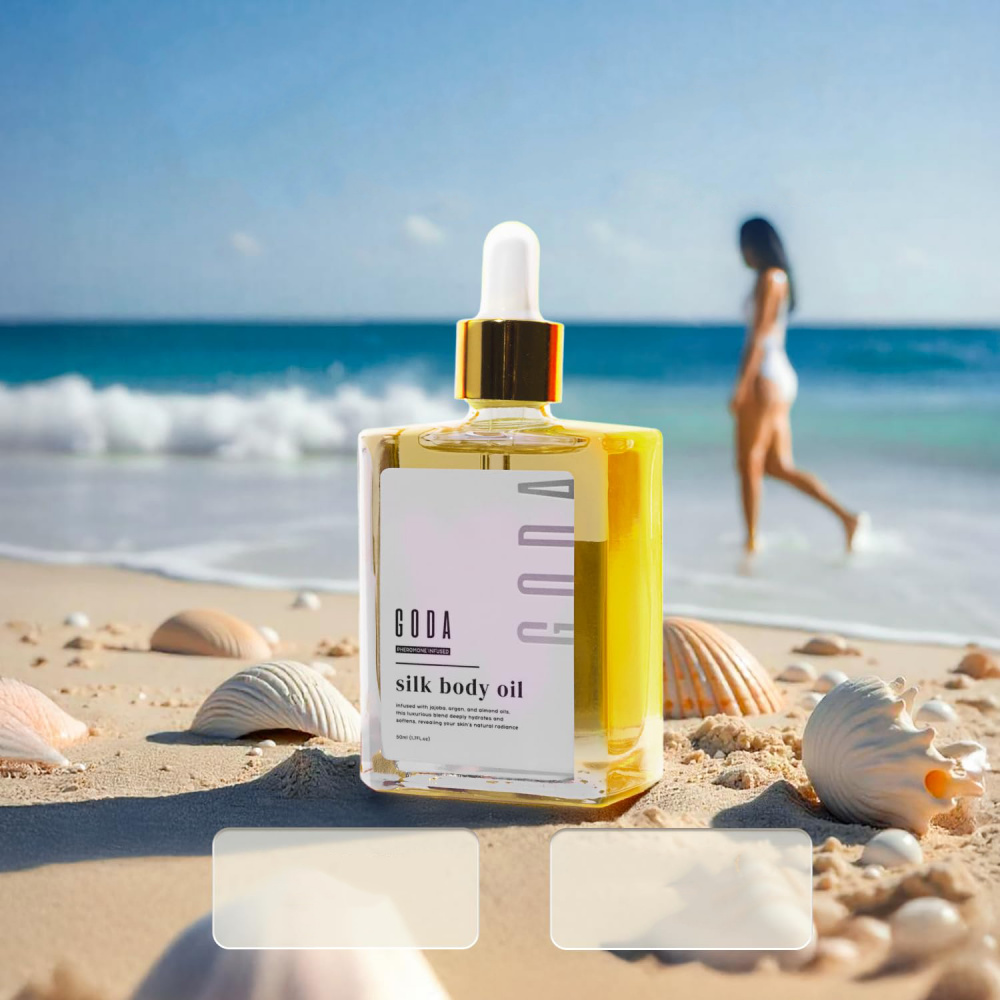 A lightweight, fast-absorbing body oil designed to deeply moisturise, soften, and enhance the look of natural radiance for smooth, touchable skin. The product shown is GODA Silk Body Oil in a premium glass dropper bottle, described on the label as pheromone infused and “infused with jojoba, argan, and almond oils.” This blend is positioned to gently hydrate and soften, helping reveal a silky glow while supporting a more supple-looking skin finish.