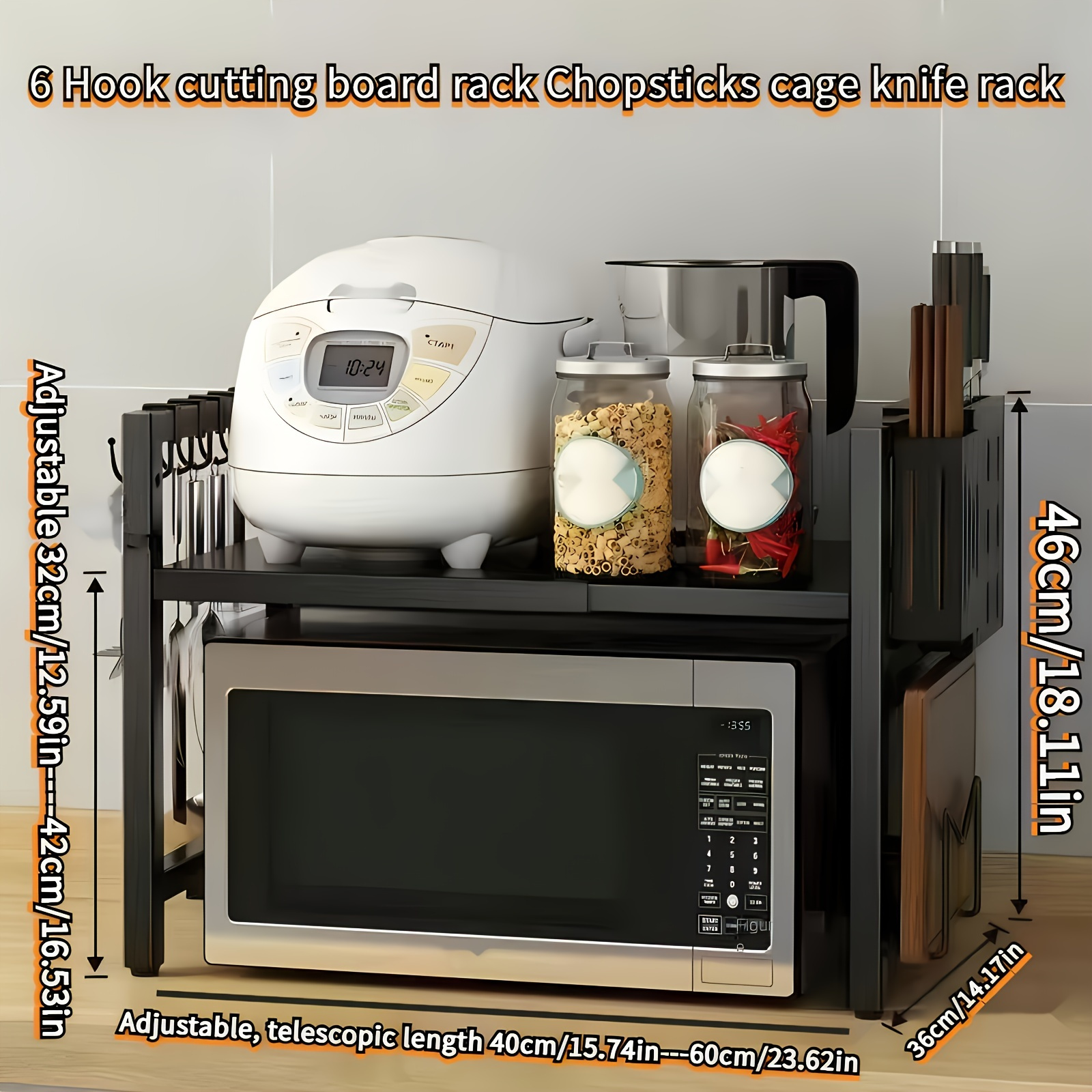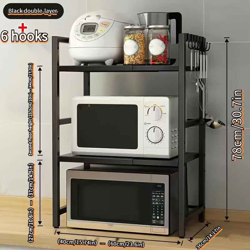 2-Tier Metal Microwave Rack – Expandable Double-Tier Kitchen Rack with 6 Hooks, Stainless Steel Double-Tier Storage Rack, Microwave Storage Rack, Countertop Rice Cooker Storage Rack, Household Storage Rack