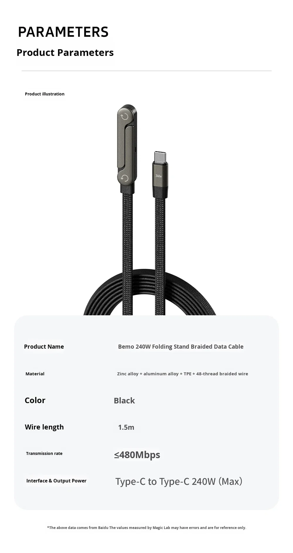 Bemo® ⚡️240W Super Fast Charging📱Invisible Holder Charger Cable with Stand supports up to 240W of high-speed power delivery for compatible USB-C devices. Designed for modern high-consumption electronics, it ensures rapid and stable charging for smartphones, tablets, power banks, and laptops that support fast charging protocols.