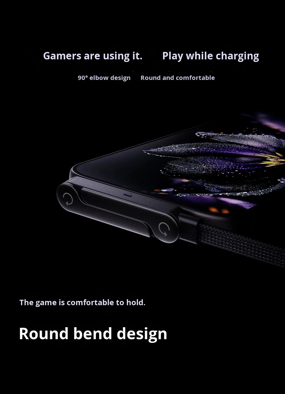 Experience seamless gaming with our T-shaped bend design: charge your phone effortlessly while playing, without compromising grip or hand feel. The ergonomic 90-degree angle keeps cables out of the way.