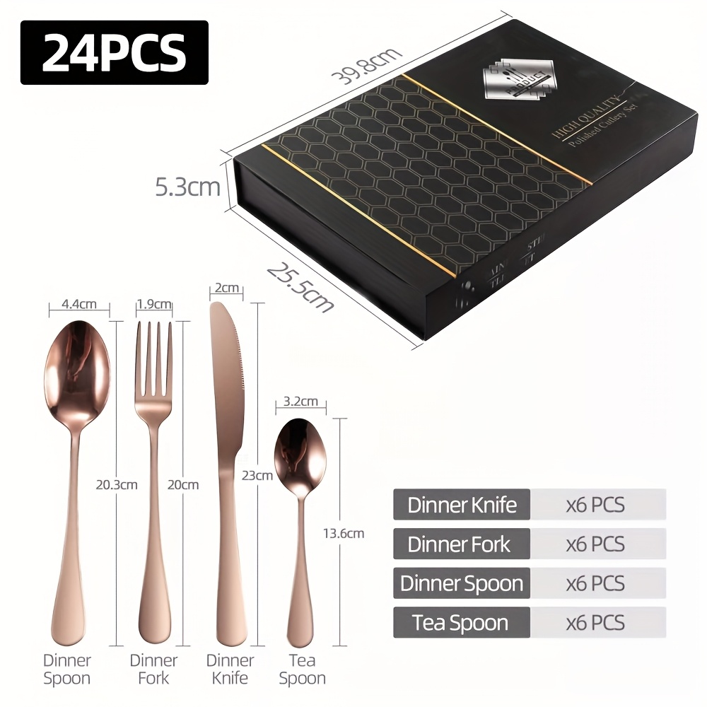 Description – 24pcs Rose Golden Stainless Steel Cutlery Set with Knife, Fork, and Spoon