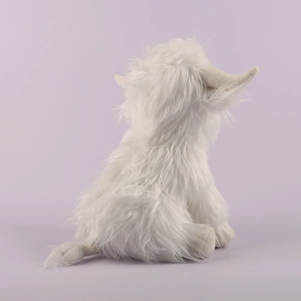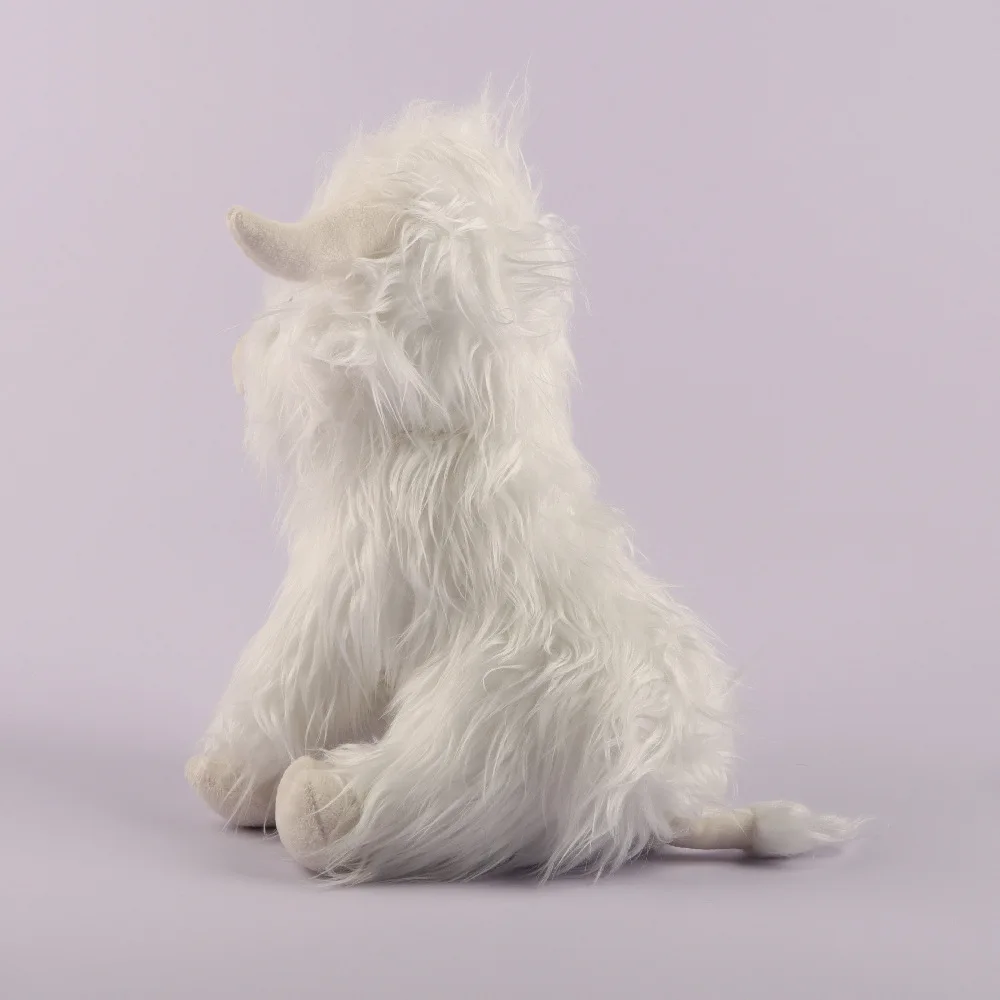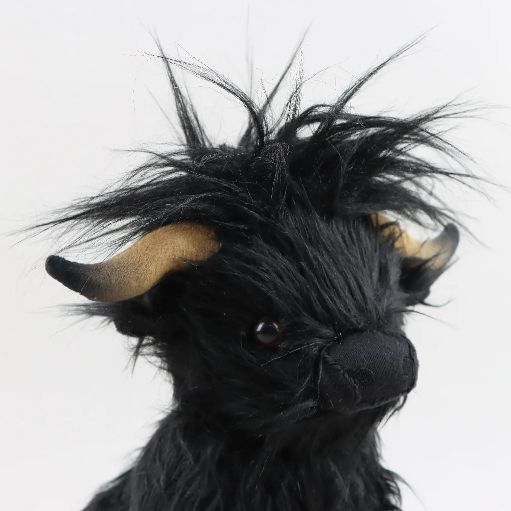 The plush toy captures the essence of a Highland Cow with lifelike details, including soft, shaggy fur, expressive eyes, and realistic features. Its cute and playful design makes it a favorite for children and animal lovers alike.