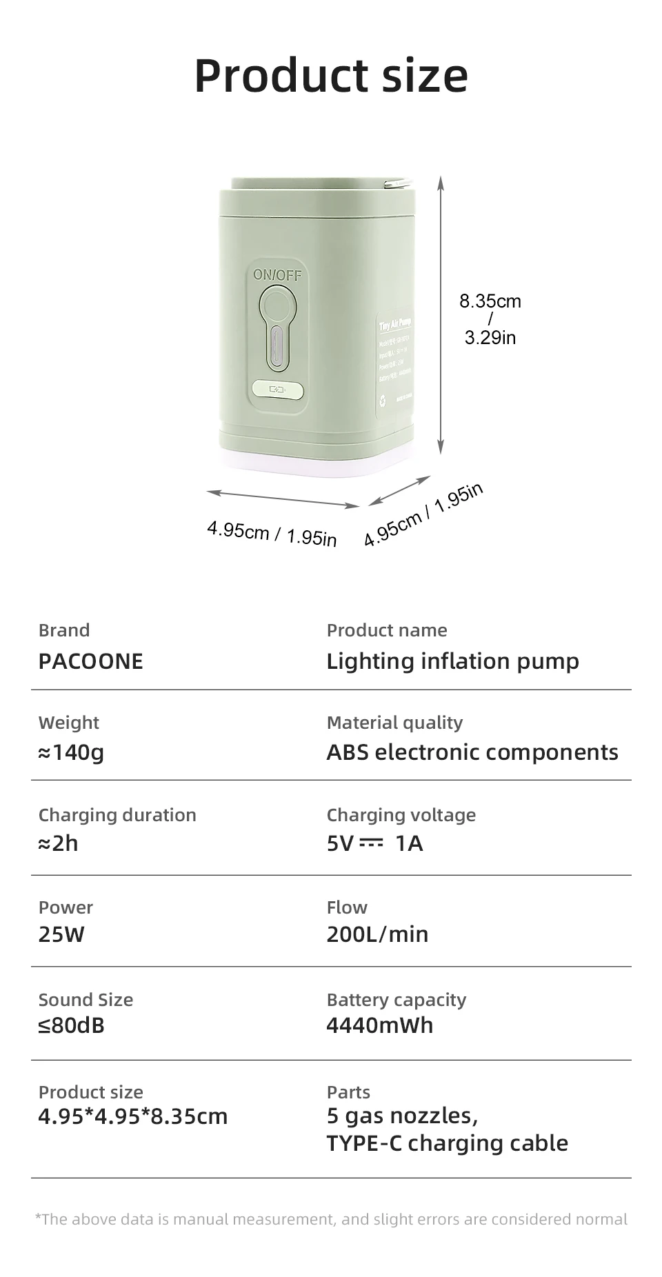 - What is the battery life on a full charge? Battery life depends on usage. For continuous operation, it can last up to 30 minutes of inflating/deflating or several hours when used as a light.