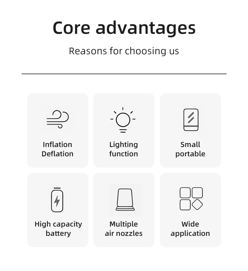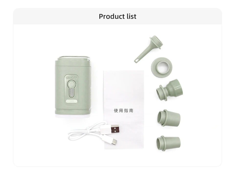 This mini wireless air compressor is designed to provide powerful and efficient inflation and deflation in a variety of settings. The pump's 3 in 1 functionality includes inflating, deflating, and providing illumination with its built-in LED light. The USB charging feature allows for convenient recharging from various power sources, ensuring the pump is always ready for use. The air pump is suitable for inflating air mattresses, inflatable boats, pool toys, and other inflatables, as well as deflating them for easy storage and transport.
