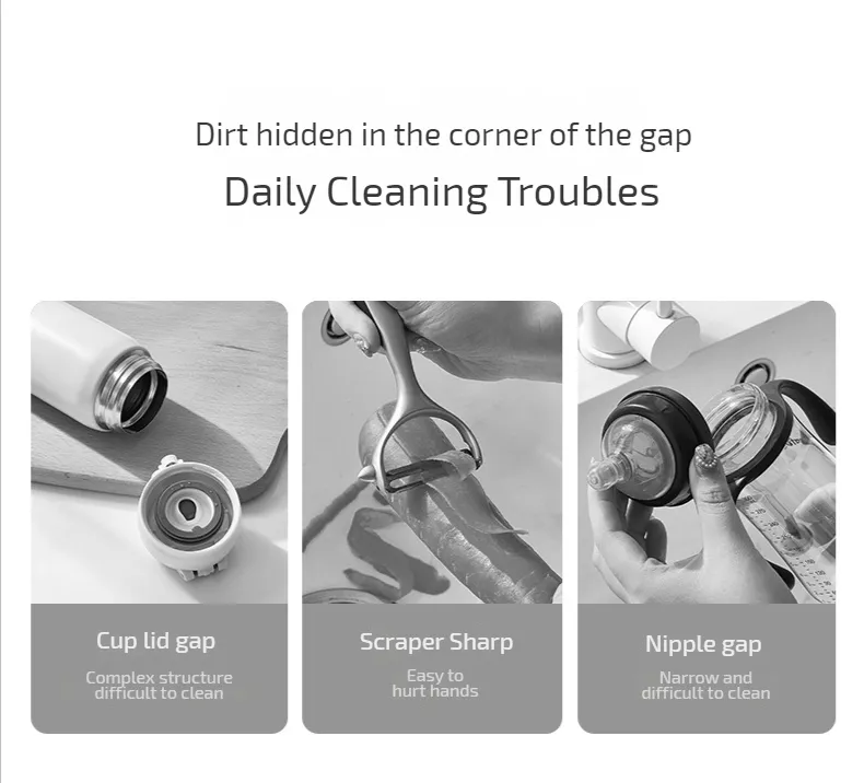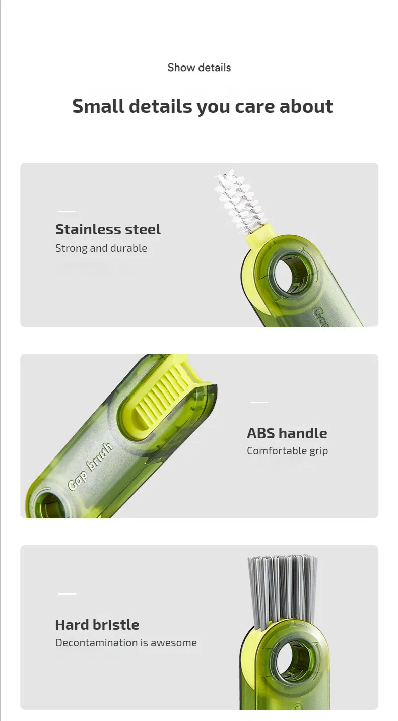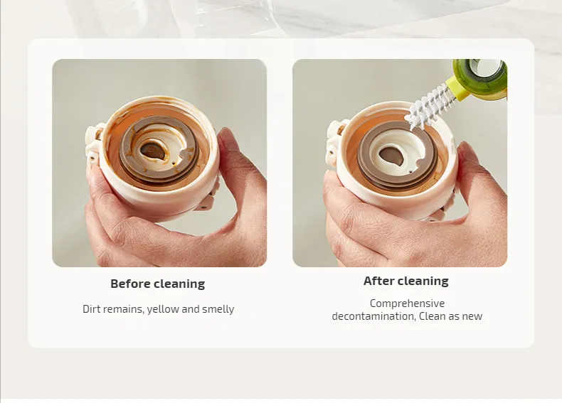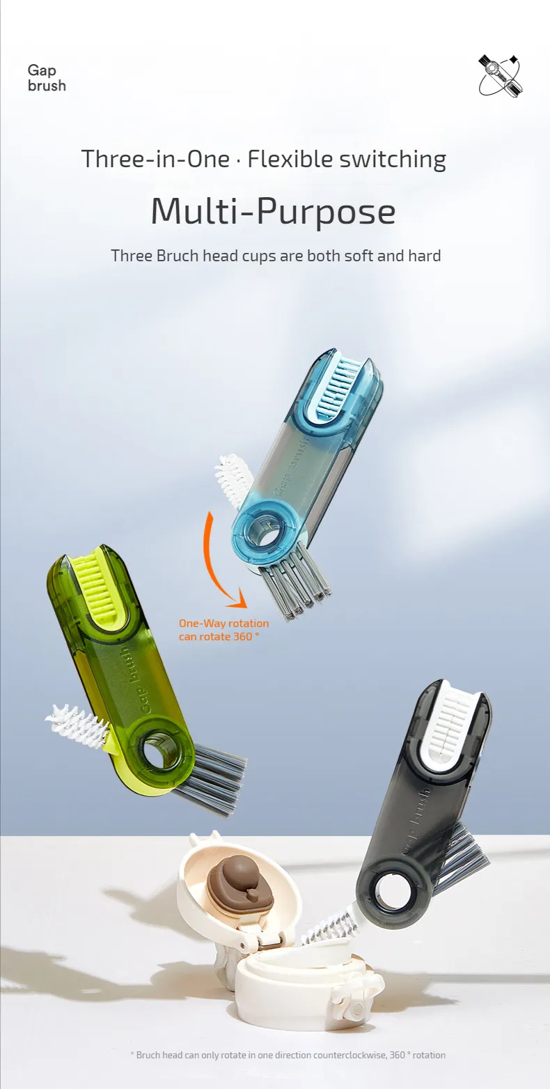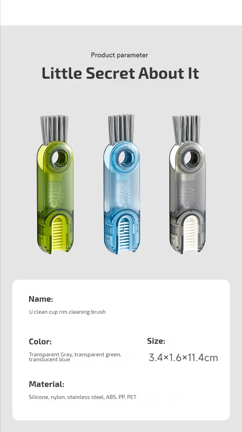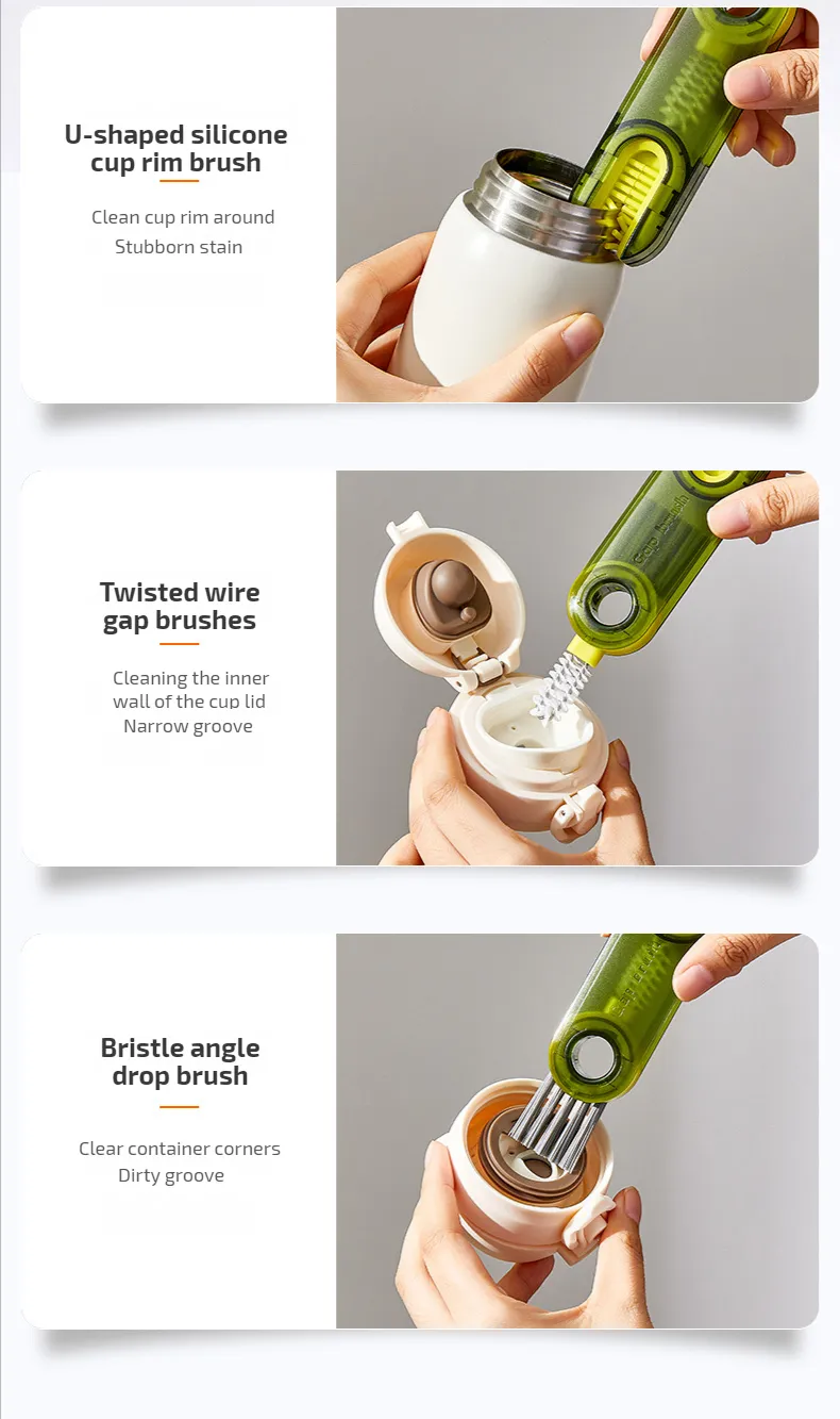 - 3-in-1 cleaning brush: U-shaped brush: match the cup mouth to clean stubborn stains around the cup mouth. ?Gap Brush: Clean the narrow grooves on the inner wall of the cup cover. ? Corner brush with hard bristles: Remove the dirt in the corner groove of the container.