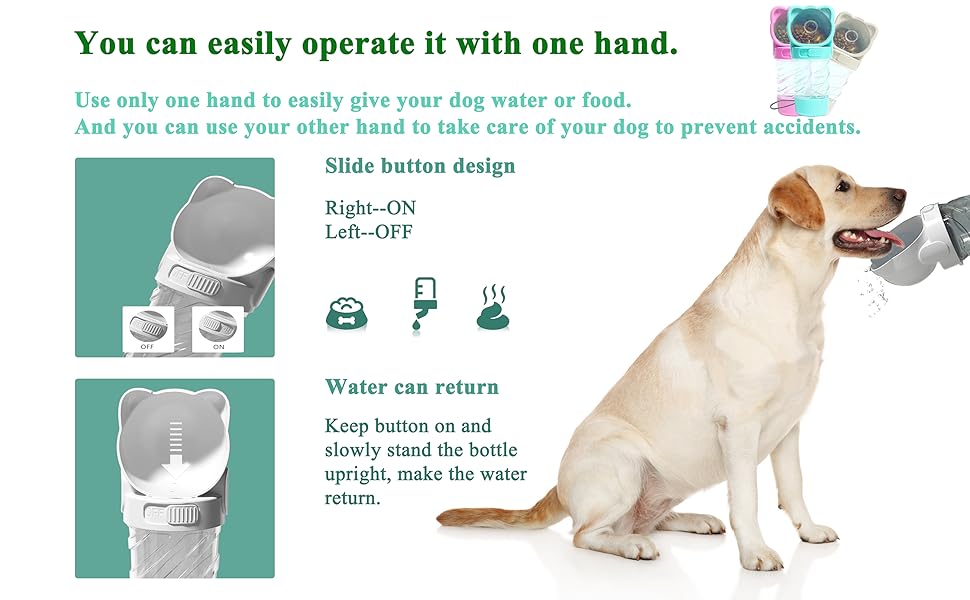 Humanized and Environmentslly Friendly: Our pet water bottle is made of food grade silicone and plastic. We use high-quality materials, drop resistance is more durable, is your best companion for pets! Rotary switch design is not easy to mispress. Don't worry to get everywhere wet or waste water any more. Unused water can go back into the container easily by turn the rotary switch.