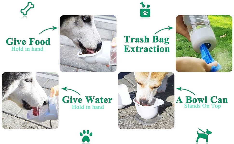 Upgraded Bigger Capacity: This water bottle can hold max 12.3 ounces (350 ml) of water and 200 g food. It not only ensures dog drinking