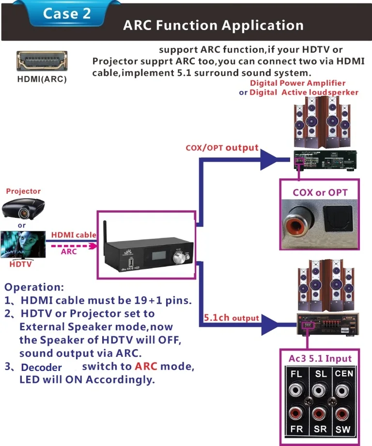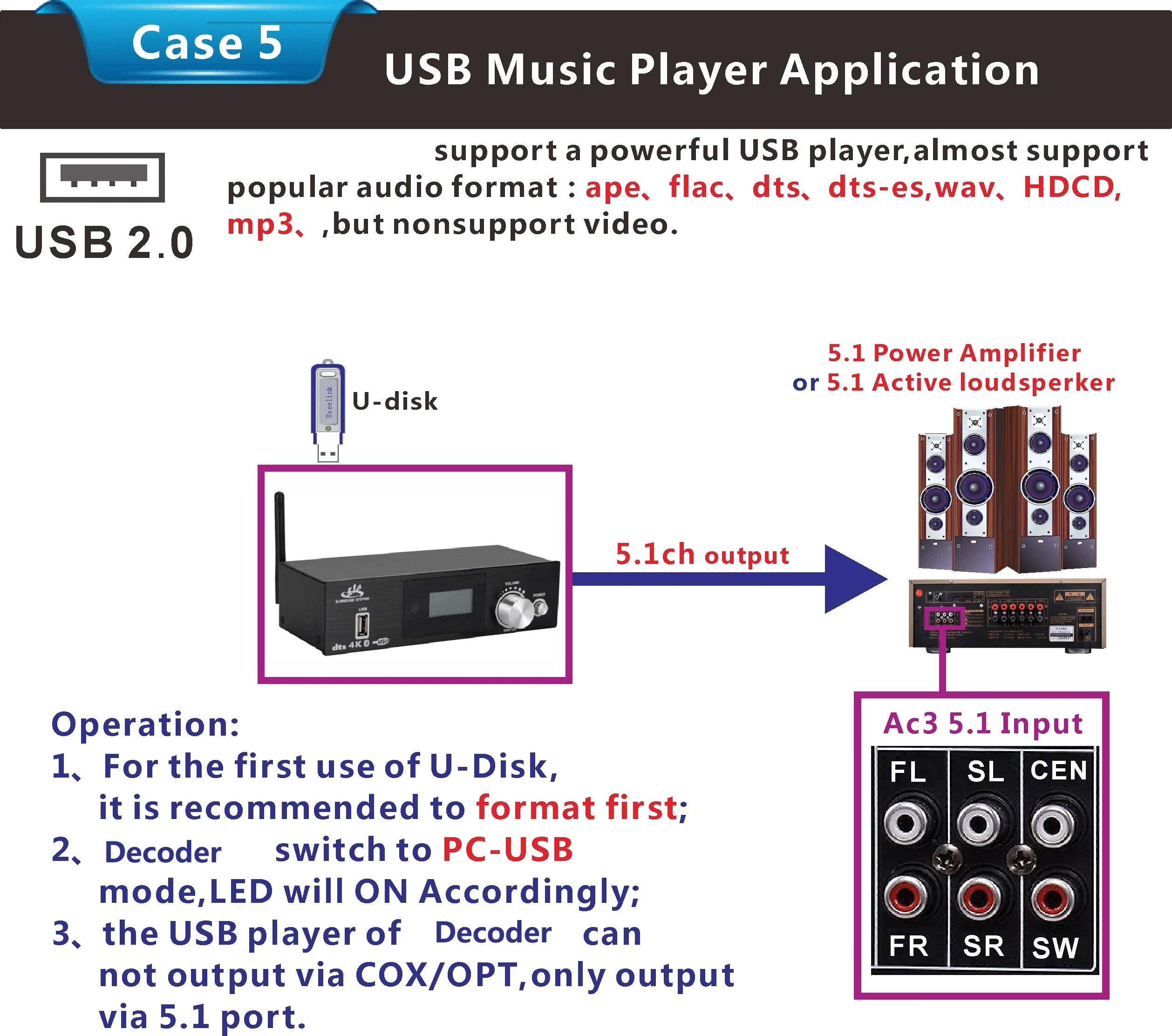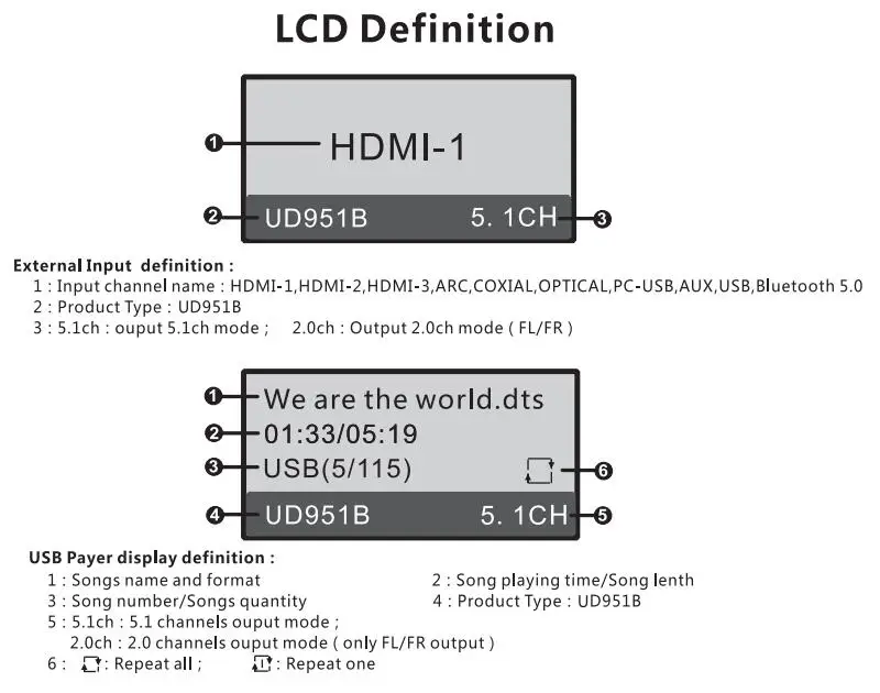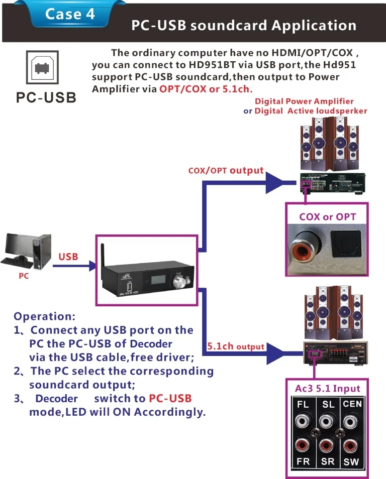 3:All signal source(HDMI/ARC/COXIAL/OPTICAL/PC-USB/AUX/USB/Bluetooth)can decode to 5.1ch output,it is audio decoder system.