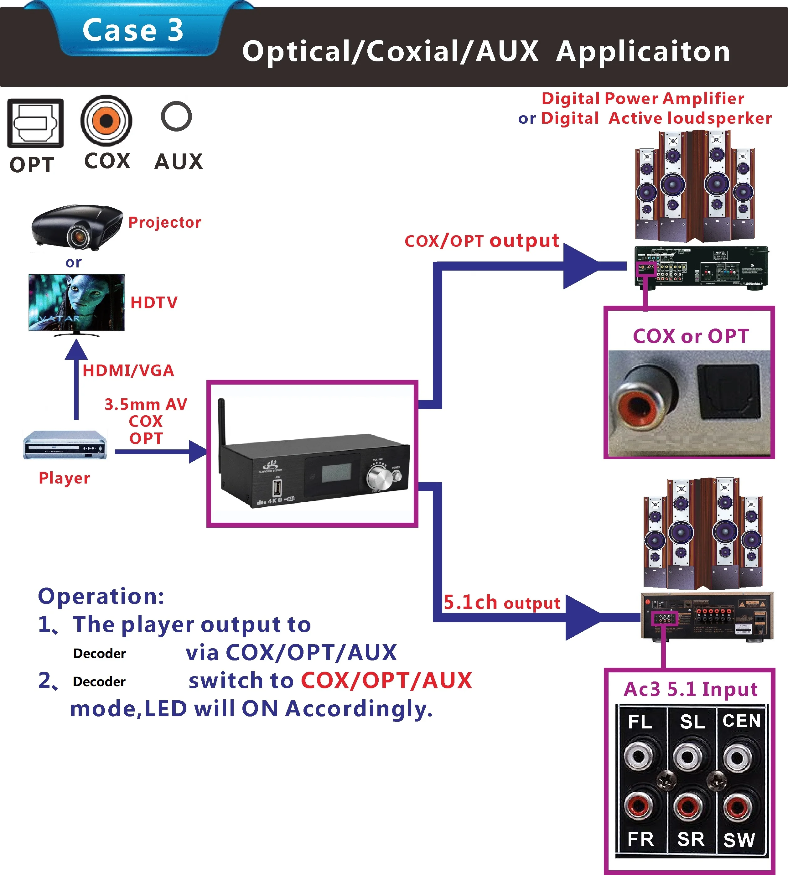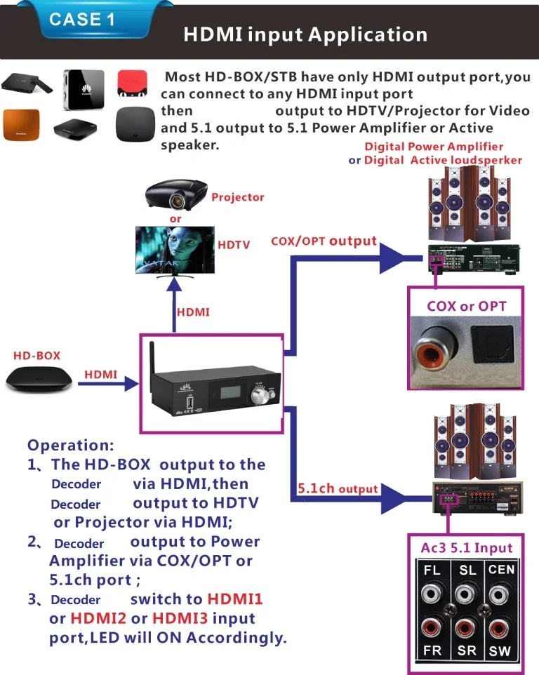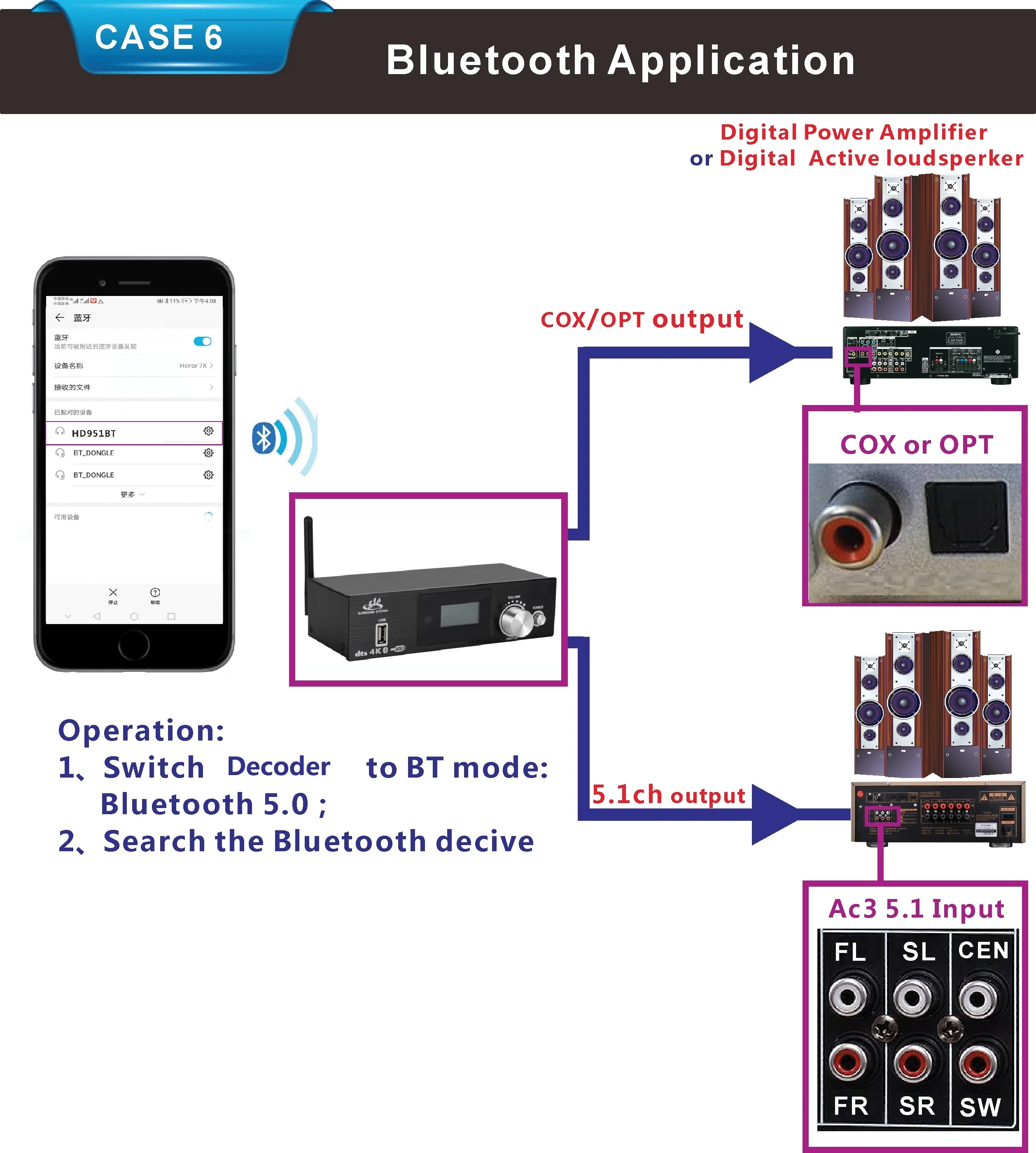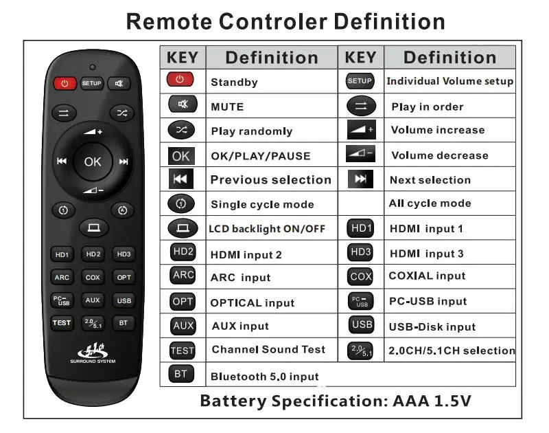 3:All signal source(HDMI/ARC/COXIAL/OPTICAL/PC-USB/AUX/USB/Bluetooth)can decode to 5.1ch output,it is audio decoder system.
