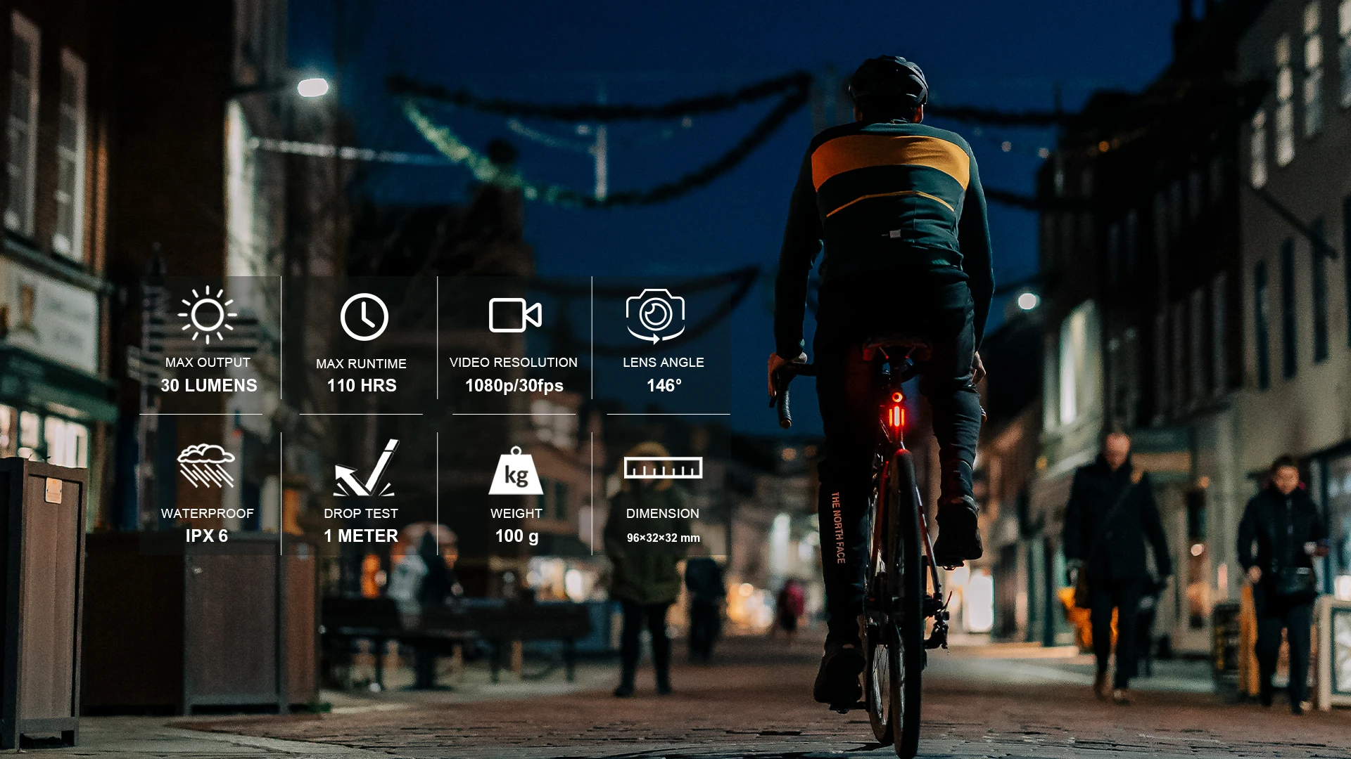 On the top are two easy-to-use operational switches — one for the tail light and one for camera recording. Powered by a 3400mAh battery with a USB-C charging port, you can adjust the camera and taillight settings to maximize battery life. Aluminum housing with plastic parts contributes to a lightweight yet robust body, with an IPX6 waterproof rating to defy adverse weather. When it comes to mounting, you can easily attach this sleek, compact device to most seat posts via the quick-release mounting system, with confidence and without tools.