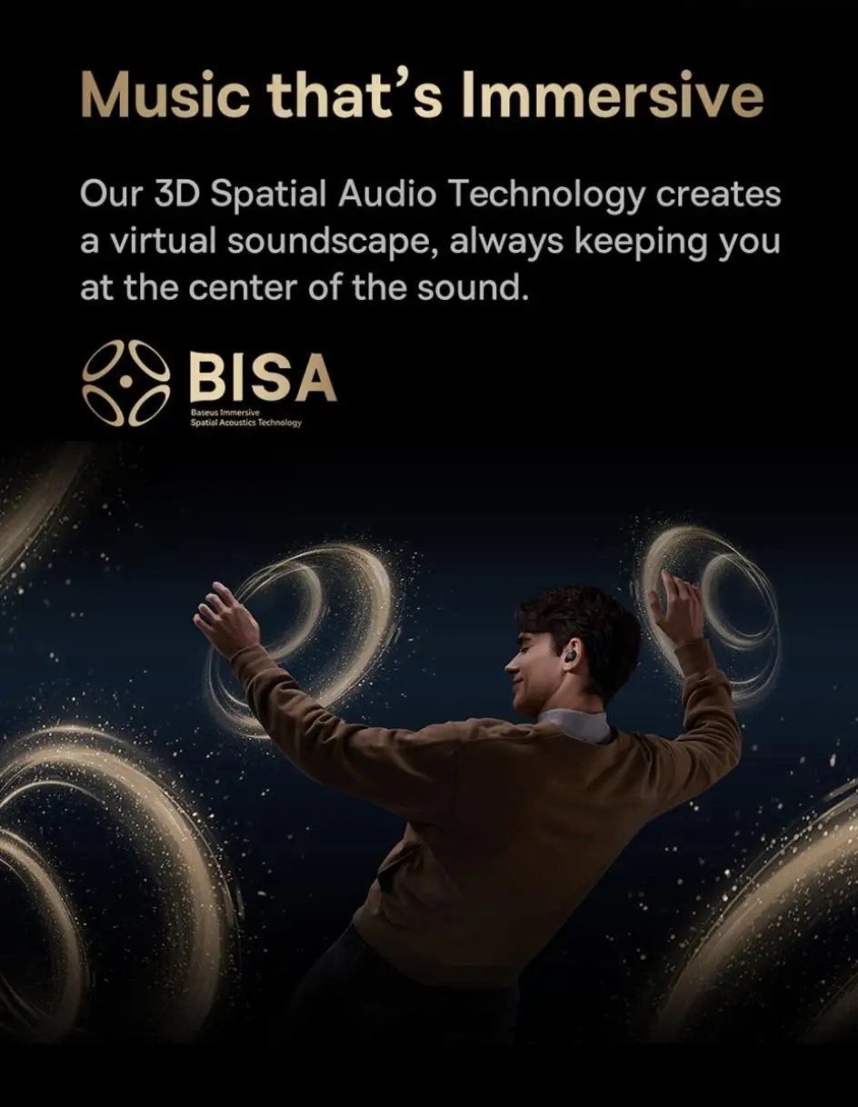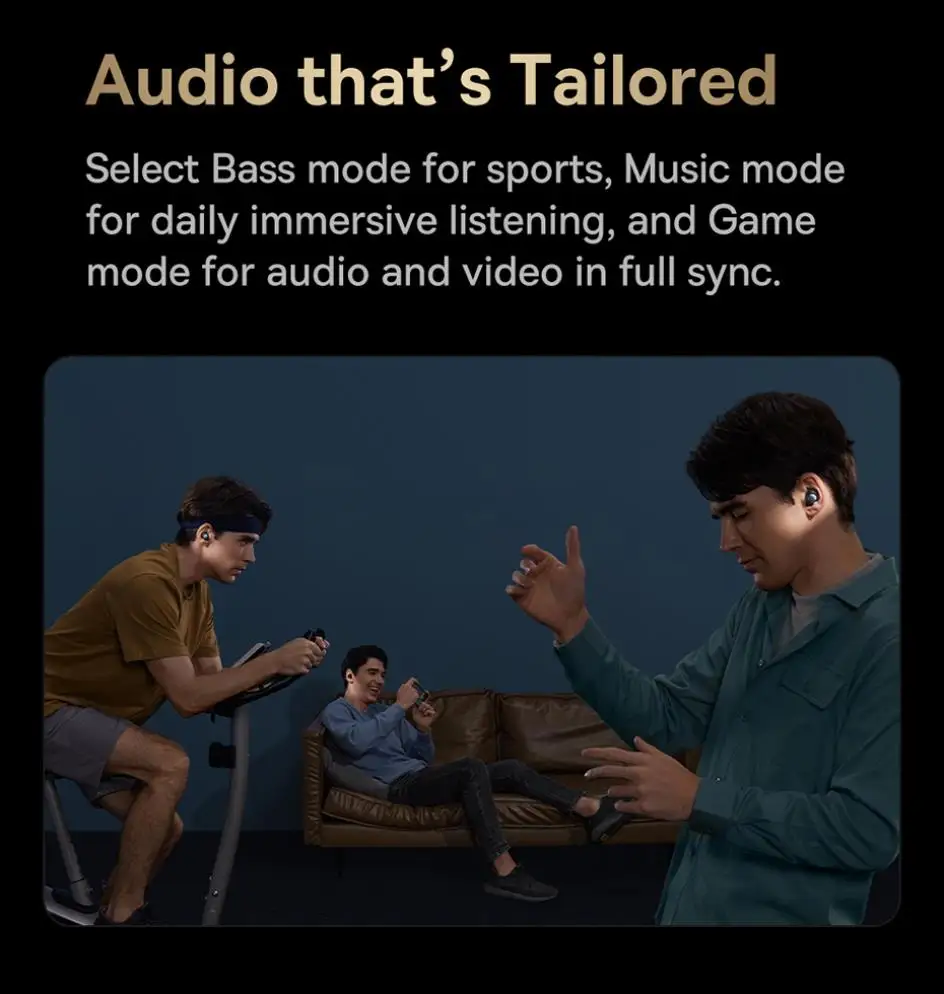 Select Bass mode for sports,Music mode for daily immersive listening,and Game mode for audio and video in full sync
