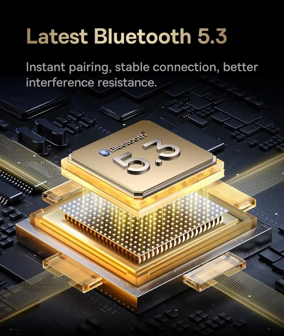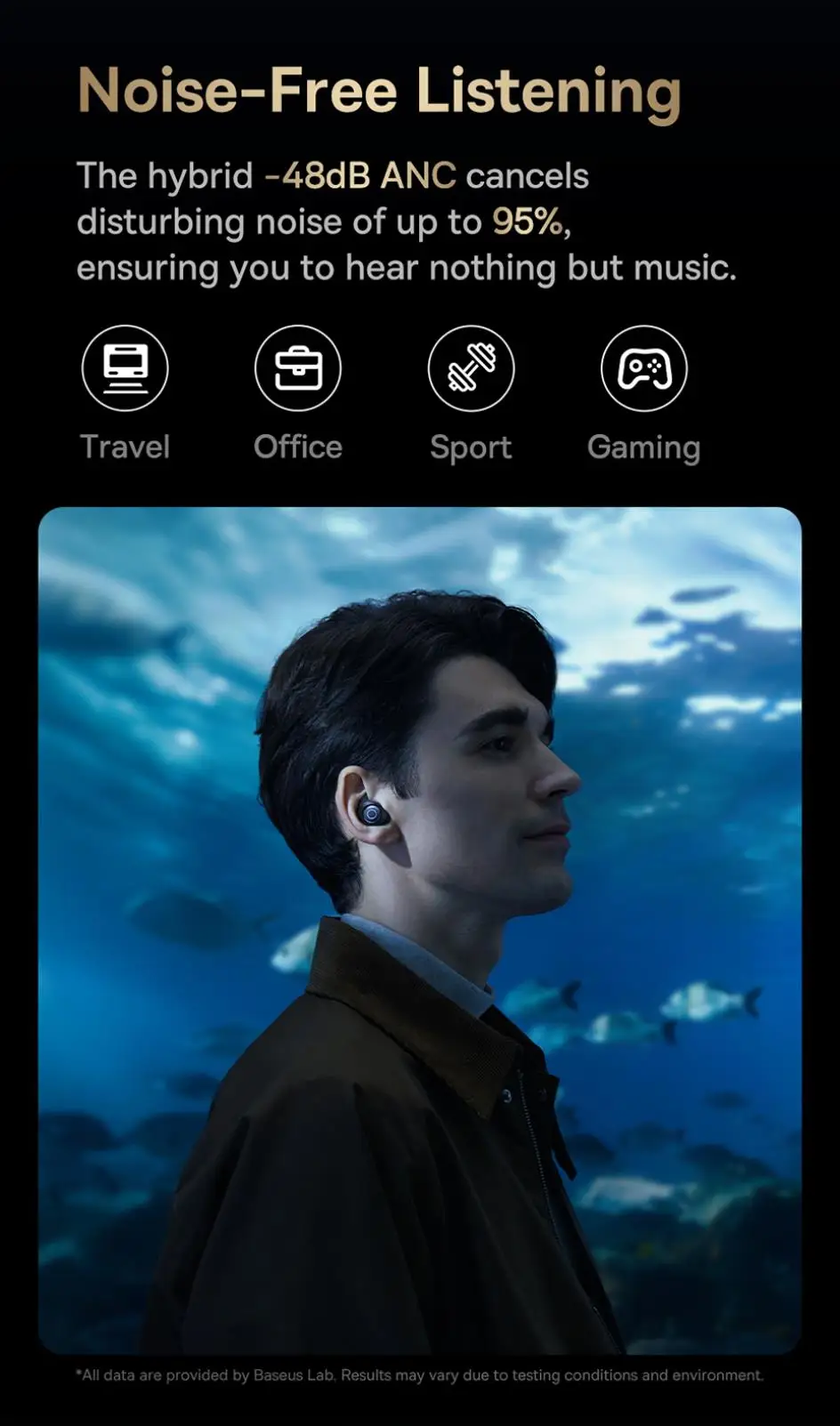 The hybrid -48dB ANC cancels disturbing noise of up to 95%,ensuring you to hear nothing but music