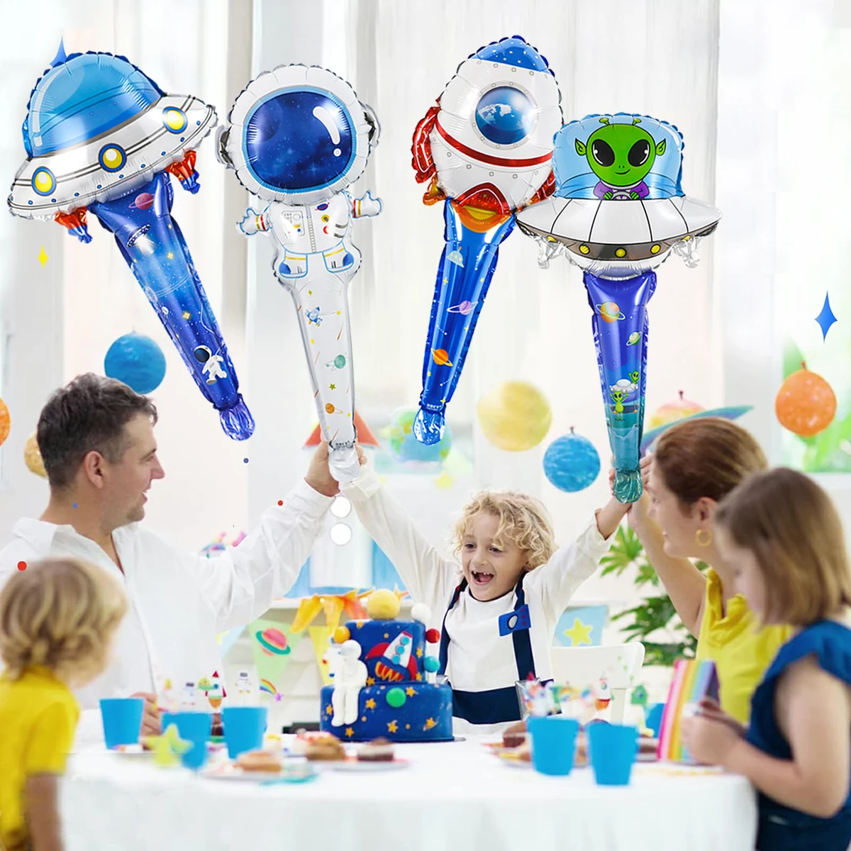 - El set incluye 4 globos con astronautas y ovnis, que capturan la emoción y el entusiasmo de la exploración espacial.