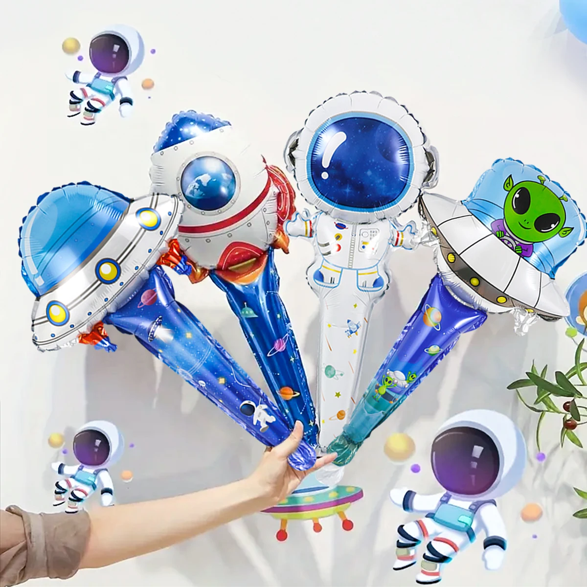 Astronauta con temática espacial sosteniendo un globo de aluminio con forma de cohete. Incluye cohetes, astronautas, extraterrestres y globos de platillo volador. Ideal para decoraciones de cumpleaños, celebraciones, aulas y fondos con temática del cielo.