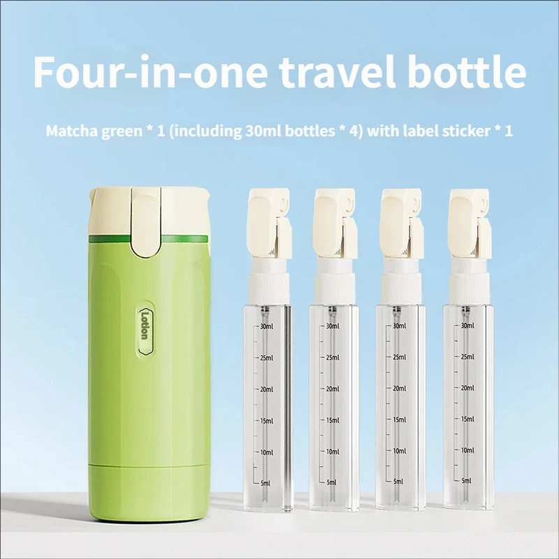This innovative set combines four travel bottles into one compact unit, perfect for storing shampoo, conditioner, body wash, and lotion for your on-the-go needs.