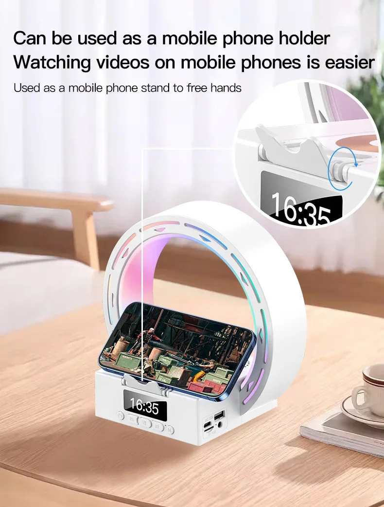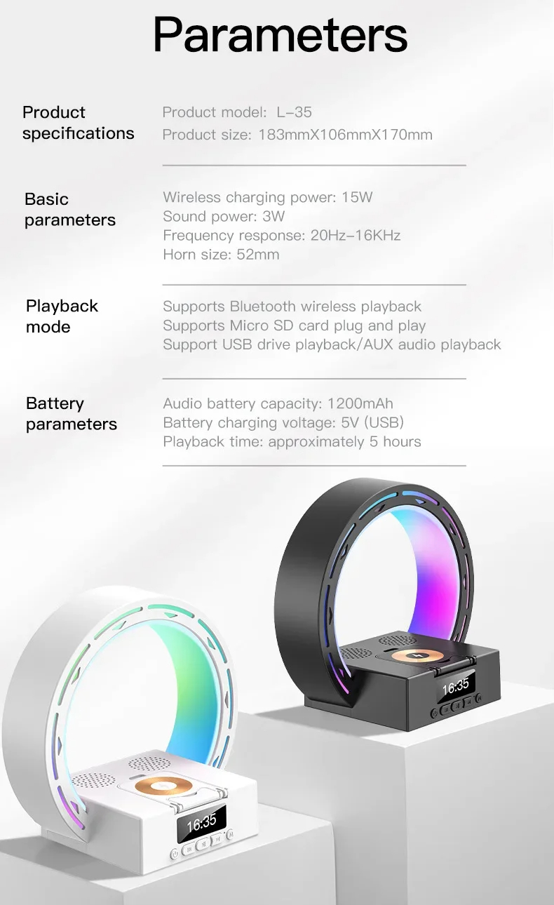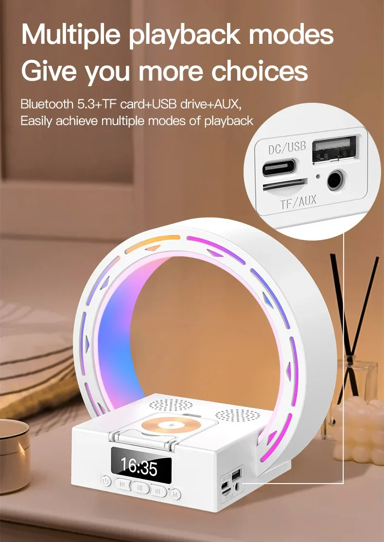 - Multifunctional Design: Combines a wireless Bluetooth speaker, wireless charging pad, bedside lamp, and alarm clock with wake-up light.