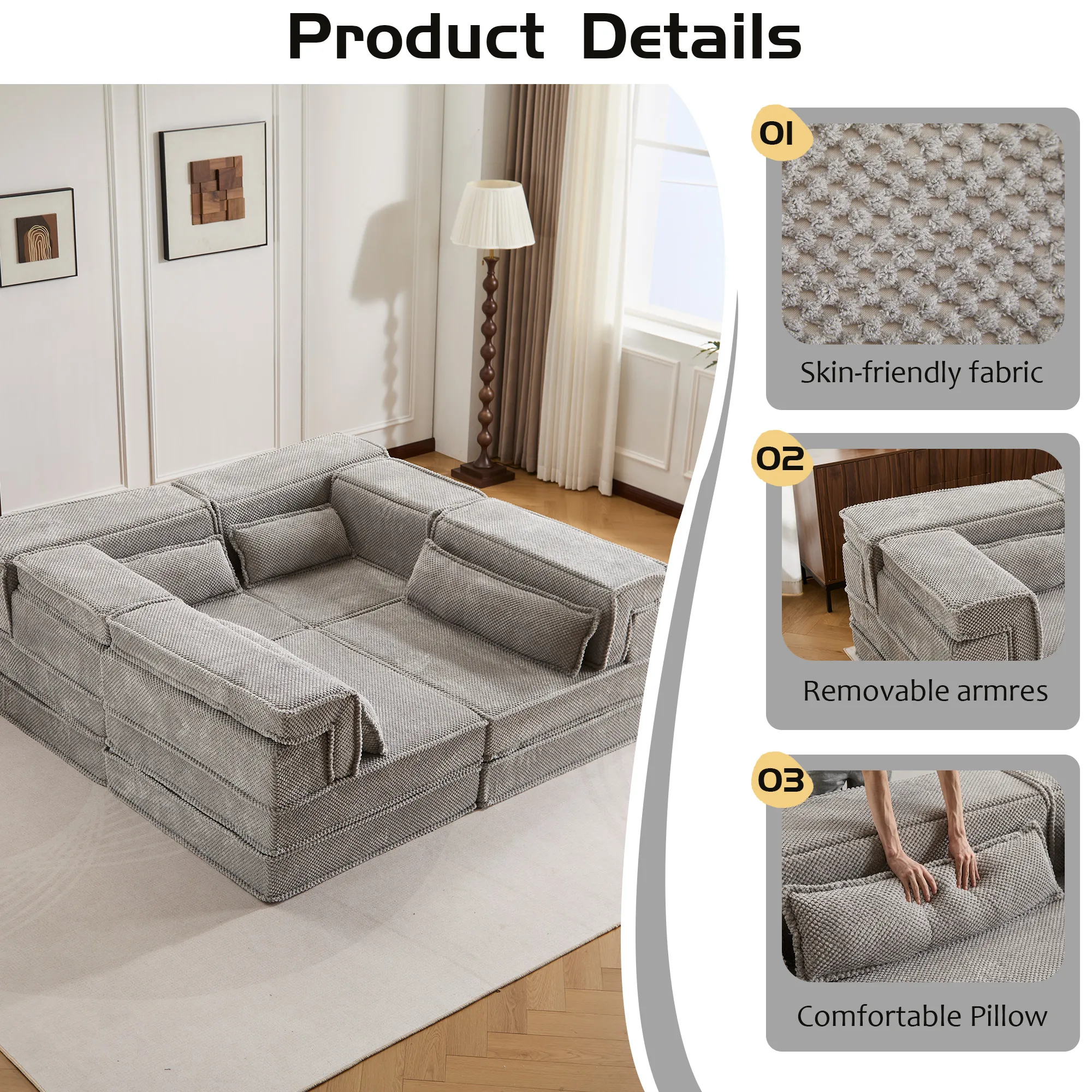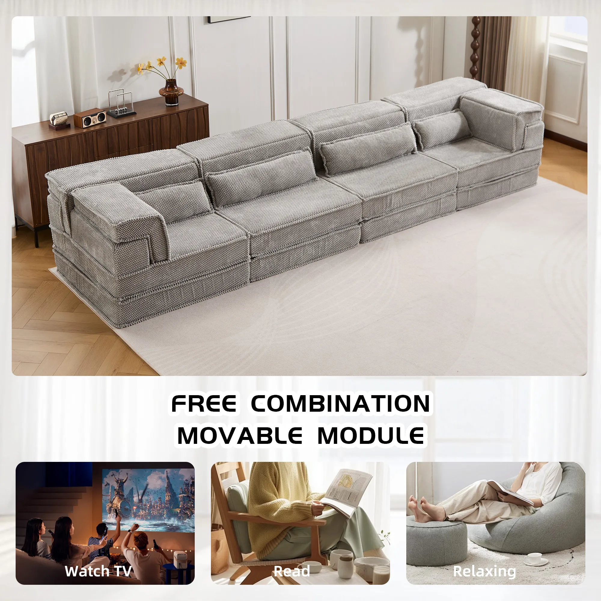 Product Name:Compression Mahjong Sofa,Convertible Floor Sofa Bed,DIY Boneless Modular Sectional Sofa,No Assembly Required,Circle fleece fabric,Oversized 4 Seater with 4 Pillows,Light-grey