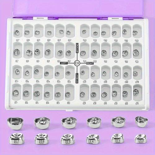 The 48pcs/Box of Dental Pre-Formed Metal Crowns provides 48 stainless steel crowns, each designed to fit over the tooth like a cap to protect it from further damage. These pre-formed crowns are designed for easy application and a secure fit, making them ideal for temporary restorations in dental procedures.