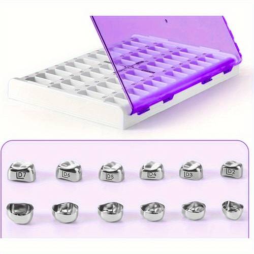 The 48pcs/Box of Dental Pre-Formed Metal Crowns offers a reliable and cost-effective solution for temporary dental crown placement and protection. Made from high-quality stainless steel, these pre-formed crowns are designed for quick, secure, and comfortable placement, offering immediate relief and protection for damaged or missing teeth. Perfect for dental professionals and clinics, these crowns are ideal for temporary use while permanent crowns are being prepared or as a protective measure for a damaged tooth.