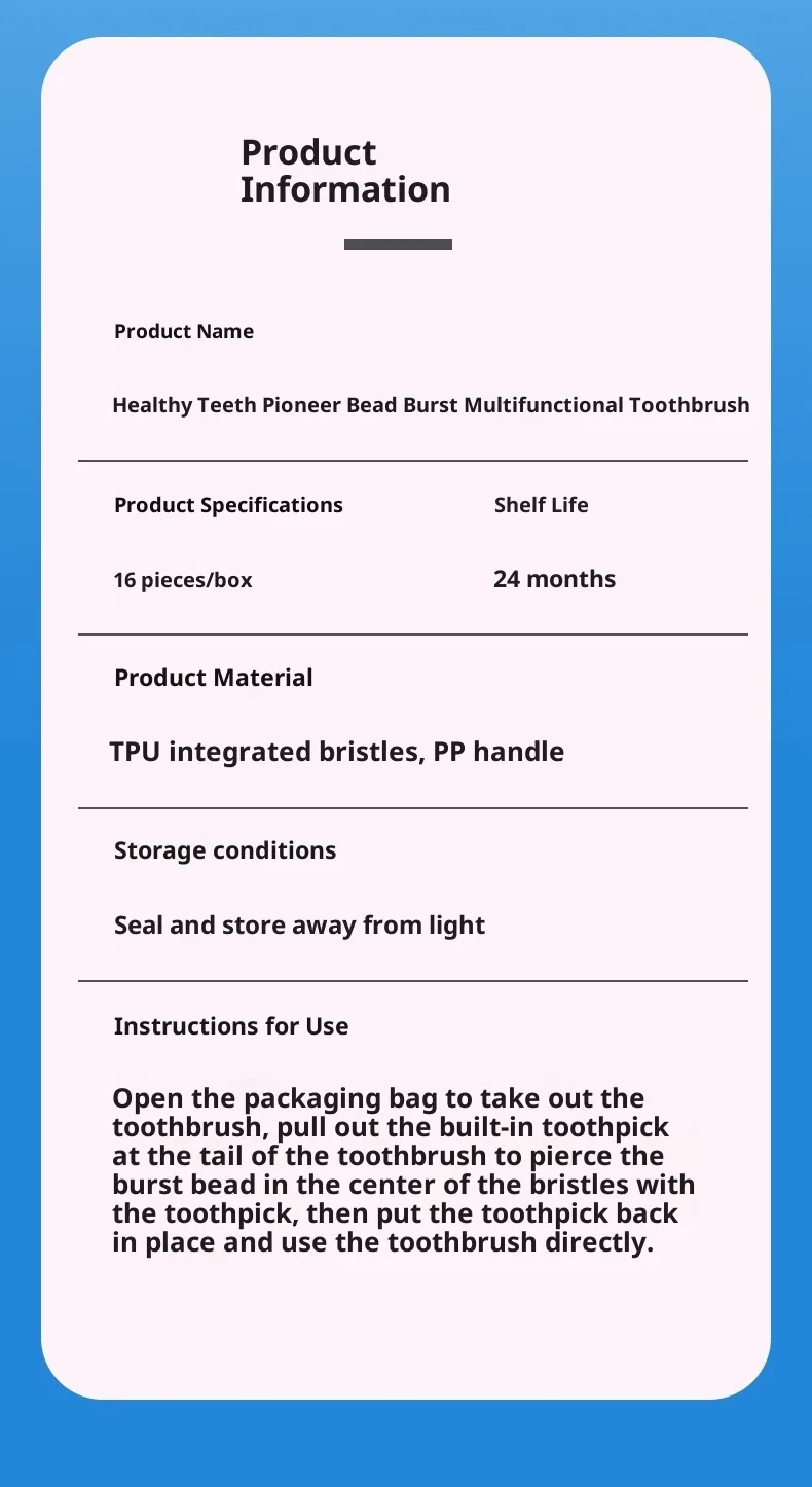 Each toothbrush integrates five functions: toothbrush, toothpaste, floss, toothpicks and tongue scrapers. It does not require a variety of oral cleaning tools, and one can easily meet daily cleaning needs.