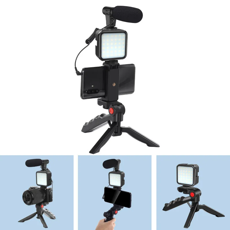 Includes smartphone holder, tripod stand, LED fill light, external microphone, and mounting bracket.