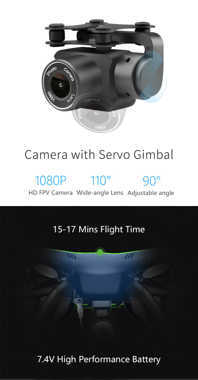 Function: up and down, left turn right turn, forward and backward, left and right side fly, follow mode, LED light, 3D roll, headless mode, fixed height mode, surround mode, trajectory flight, electric steering gear, photo recording, APP gravity , WIFI map transmission, induction operation, one-button take-off / landing;