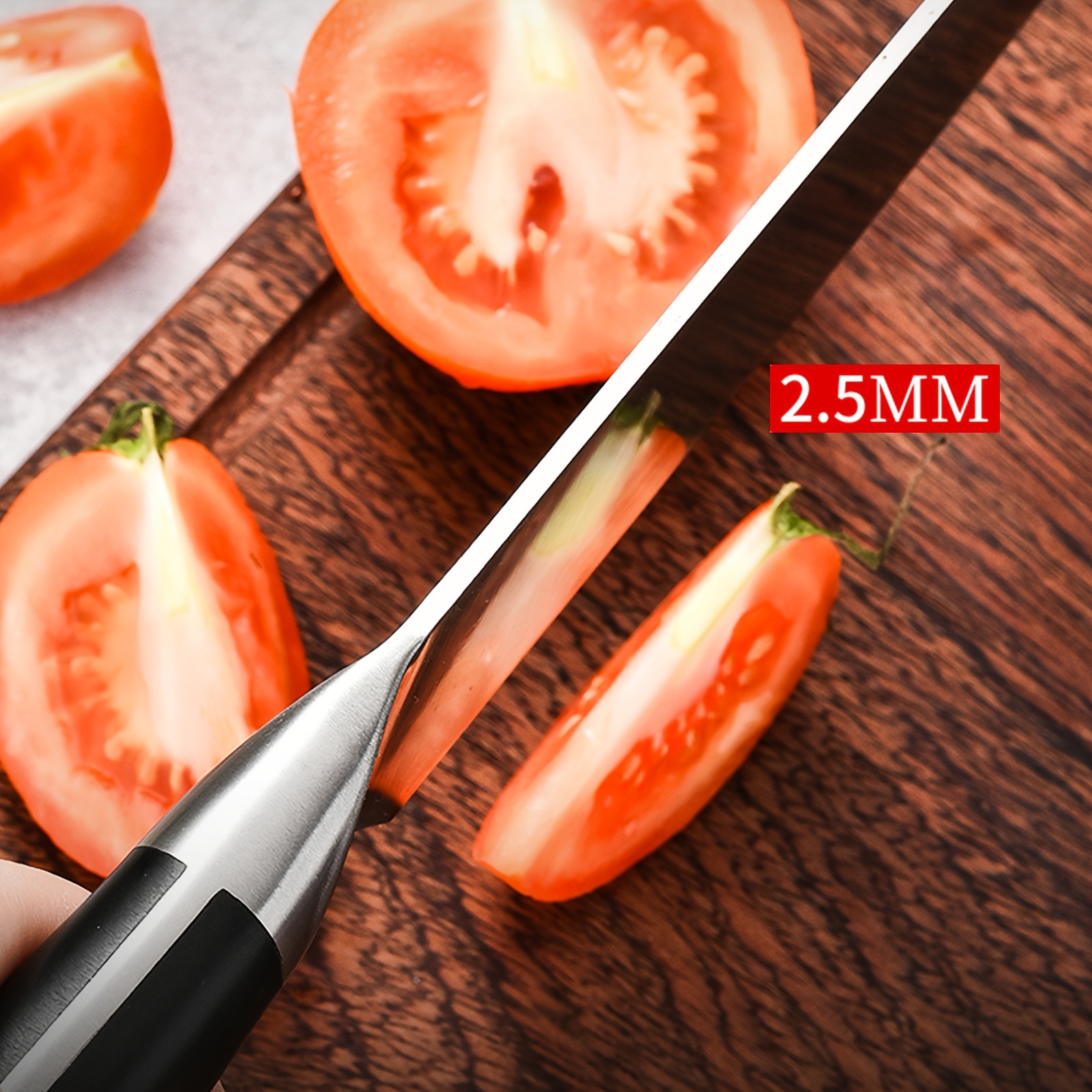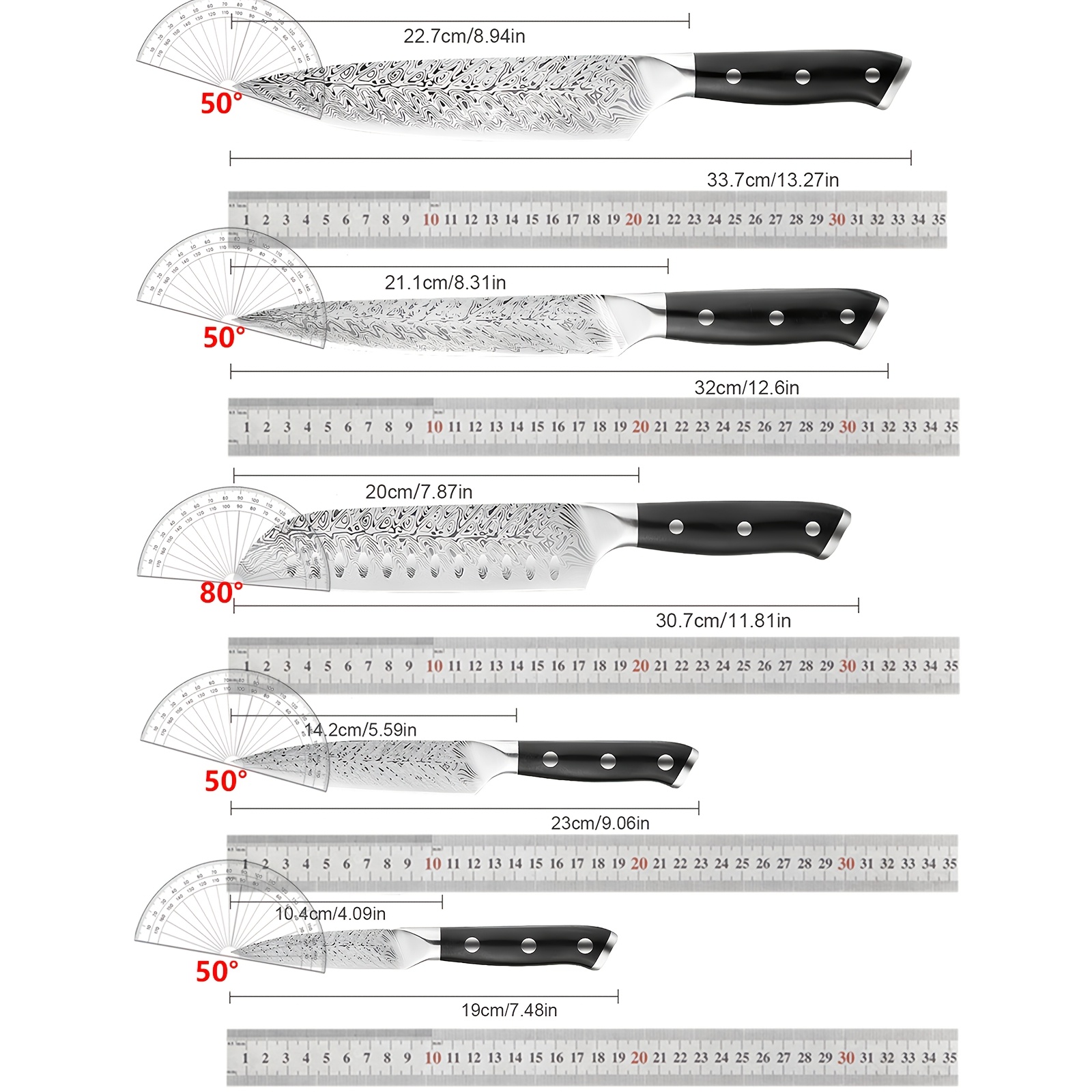 Packing List: 1X 3.5 inch Paring knife 1X 5-inch universal knife 1X 7 inch Cleaver knife 1X 8 inch Chef knife 1X 8 inch Slice knife Each knife is equipped with a knife cover
