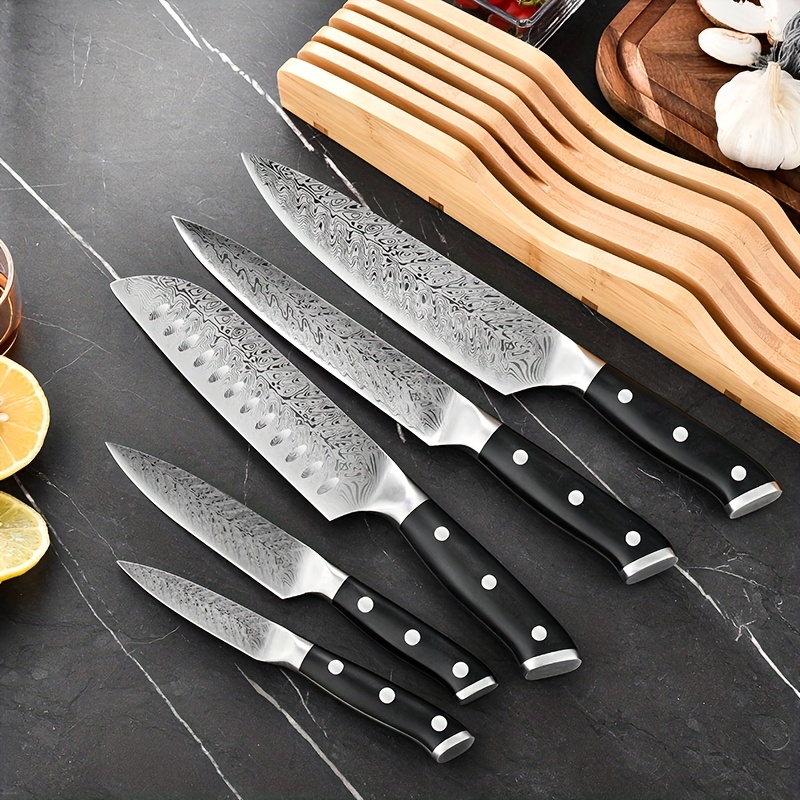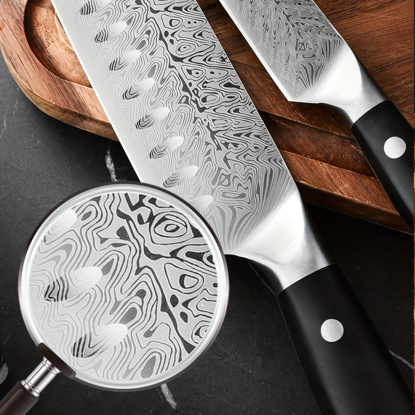 - Damascus Patterned Stainless Steel: Each knife features a stunning Damascus pattern, providing both a sharp edge and a visually striking appearance.