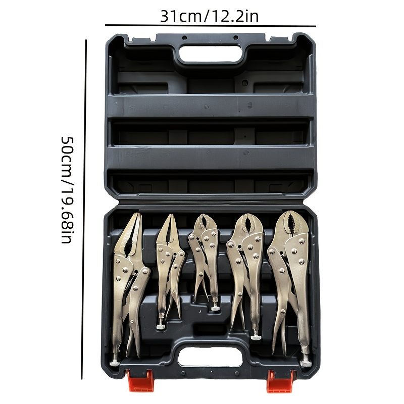 The 5pcs Standard Locking Pliers Set is an essential tool kit for anyone who needs a reliable solution for clamping, repairs, and mechanical work. Featuring adjustable vise grip locking pliers in various sizes (12.7 cm, 17.78 cm, 22.86 cm, and 25.4 cm), this set includes both curved jaw and long nose pliers, all neatly organized in a storage case for easy access and portability.