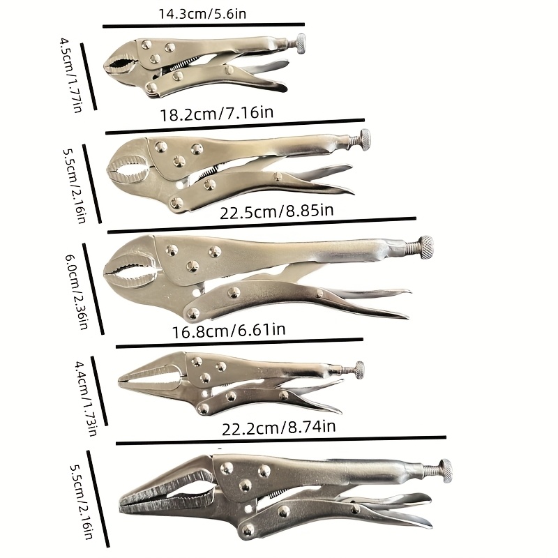 - 5-Piece Tool Set: Includes four locking pliers in varying sizes (12.7 cm, 17.78 cm, 22.86 cm, and 25.4 cm) to cover a wide range of clamping needs.